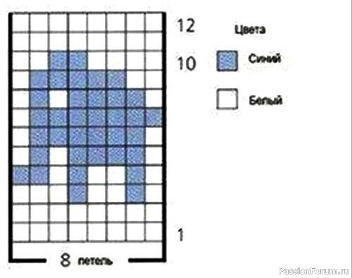 Перейдите на нить белого цвета и вяжите по схеме, повторяя 8 петель орнамента 12 (14) раз. Продолжайте вязать по схеме 12 рядов, затем выполните 1 ряд лицевыми и 1 ряд изнаночными синей нитью, чтобы вывязать верхнюю синюю полосу.
