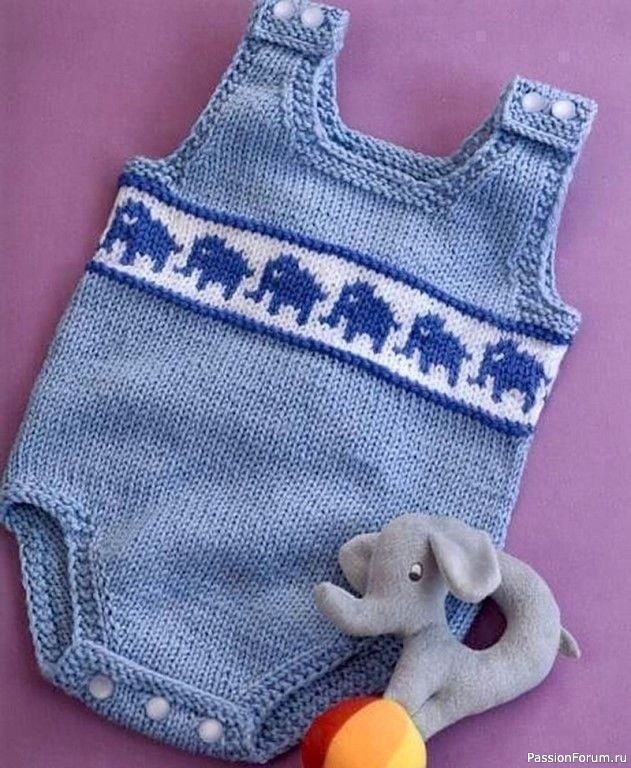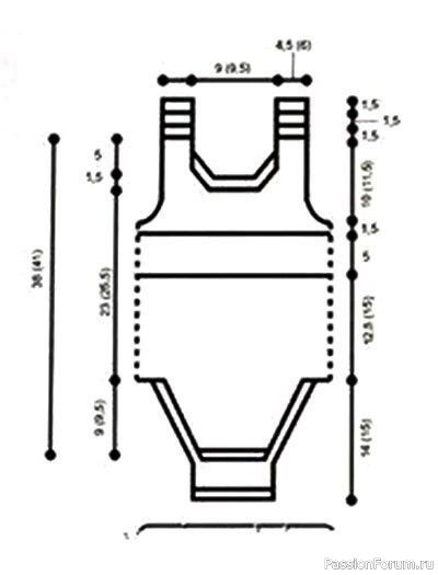 Нижняя часть спинки и переда комбинезона вяжутся отдельно. Затем средняя часть комбинезона до пройм вяжется по кругу.