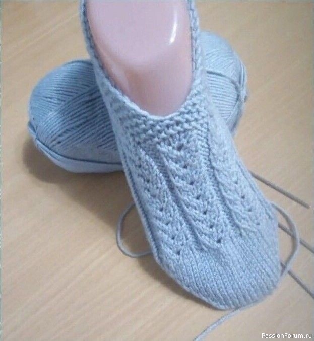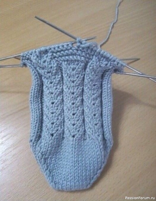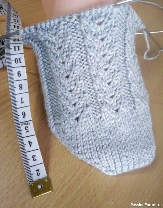 1 ряд (пятки): кром., 4 изн., 6 лиц., 3 изн., 19 лиц., 2 вместе – лицевой, разворот: 1 снять, 10 изн., 2 вместе – изнаночной, разворот: 1 снять, 10 лиц., 2 вместе – лицевой.