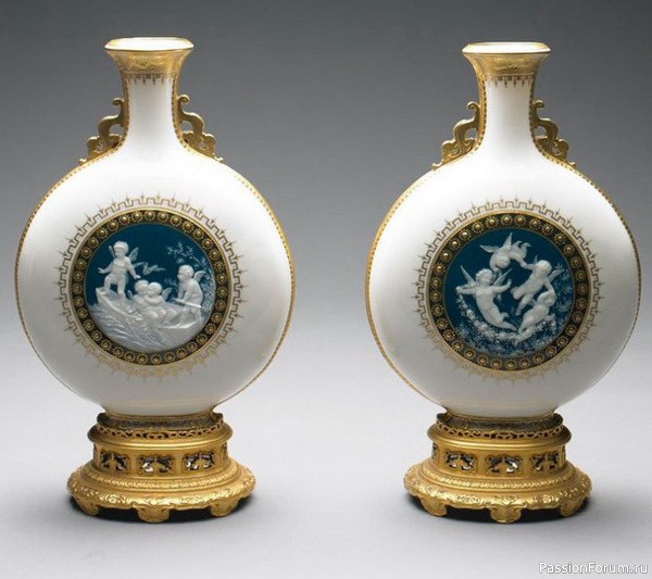 Пара фарфоровых лунных фляг, расписанных Генри Холлинзом, учеником Марка-Луи Солона, в технике pâte-sur-pâte, фирма "Minton", Англия, около1882 г., Художественный музей Бирмингема.