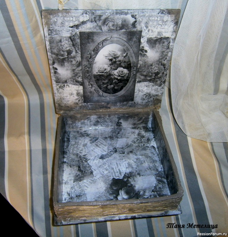 Здравствуйте, дорогие феечки! Эта шкатулка начиналась твориться именно как шкатулка, а получился футляр для столовых приборов))) Когда мне попалась в руки коробка достаточно больших размеров, то я долго думала пустить ее на картон или сделать шкатулку-книгу. Книга победила))) Работы было много по укреплению, обклеиванию, шпатлеванию. Когда работа уже подходила к концу, выяснилась острая необходимость в новой упаковке для столовых приборов в качестве подарка, так как родная упаковка находилась в ужаснейшем состоянии. Эта моя огромная книга-шкатулка подошла идеально. Теперь набор стал красиво оформлен. В работе использовала кружево, трафареты, массу для лепки и распечатки. Небольшую часть окрасила акриловой краской, поверх кружева прошлась перламутром.