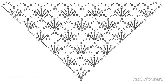 Полотно вяжется по схеме прямыми и обратными рядами. Начинаем вязание с 3 ВП. Далее делаем 5 ССН в 3 ВП от крючка, при этом между столбиками делаем по 3 ВП. В последующих рядах делаем вместо ССН — 3 ПП. Последний СНН ряда выполняем в 3 ПП предыдущего ряда.