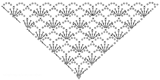 Начинаем наше вязание: косынка для женщин крючком вяжется основным узором. Первые 4 ряда выполняем строго по схеме.