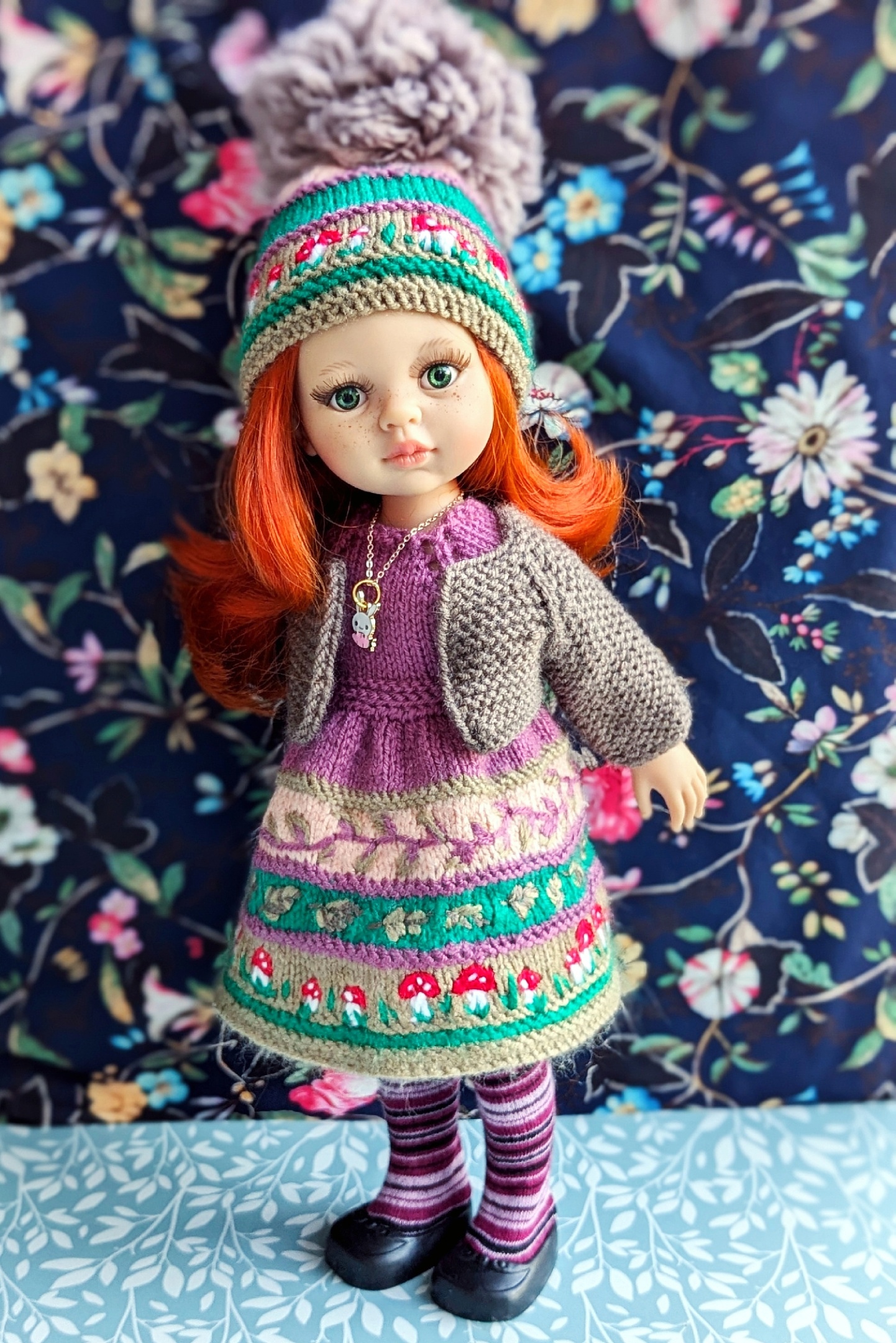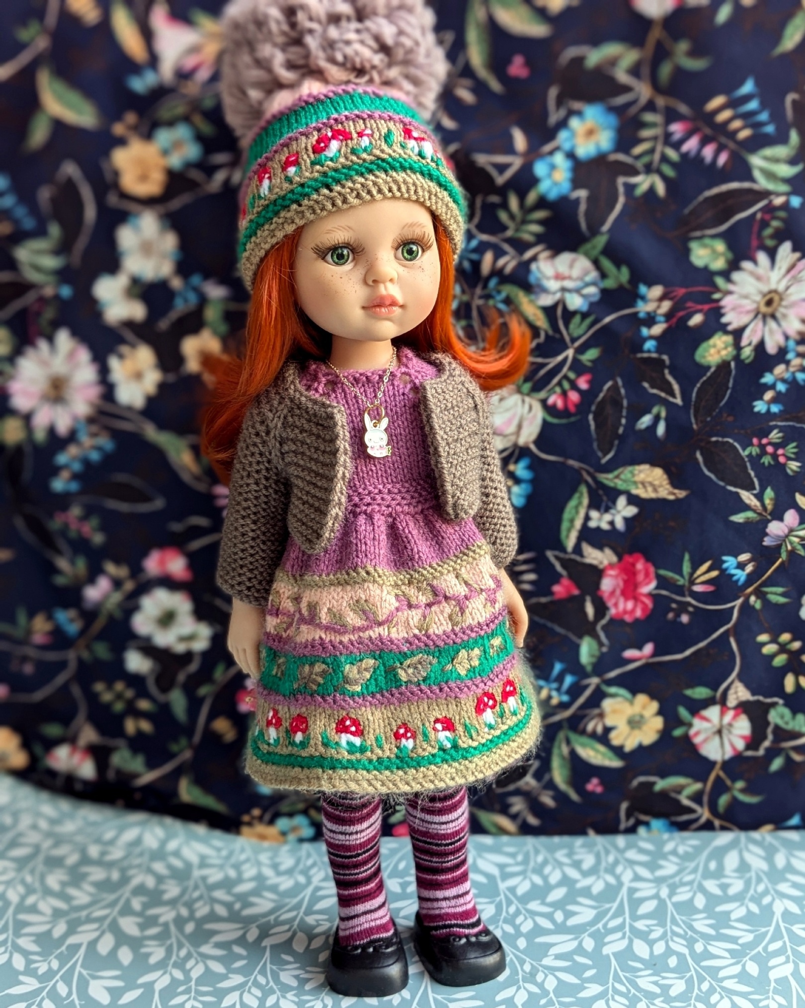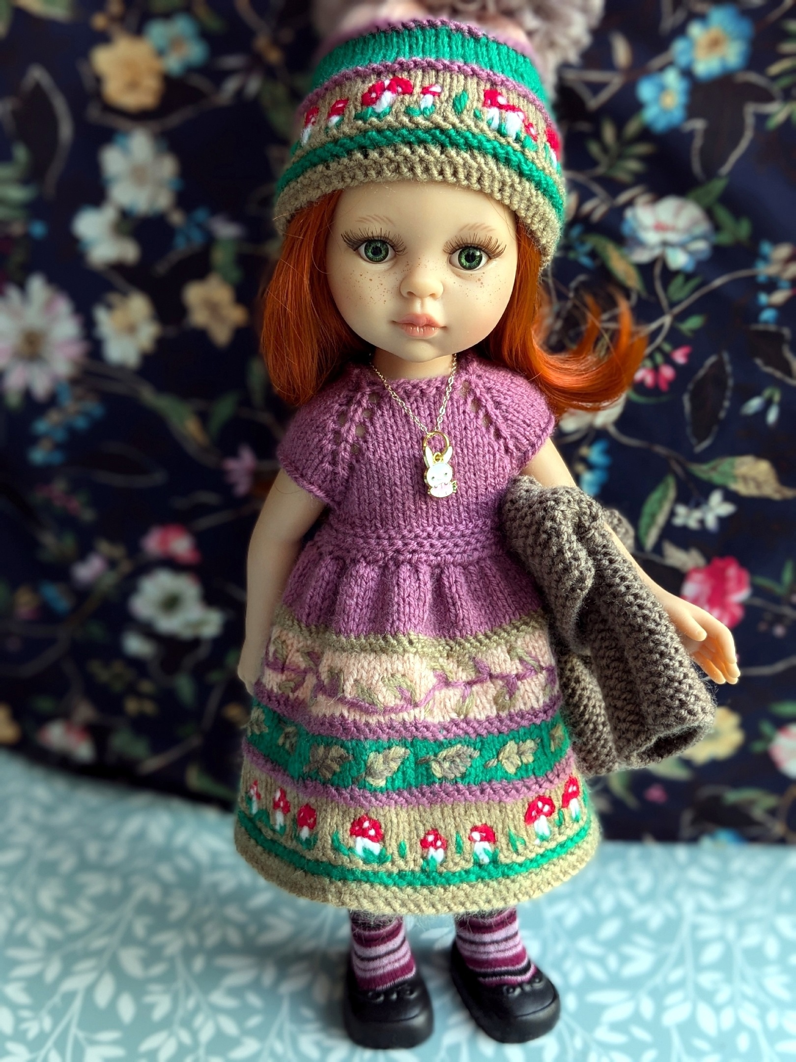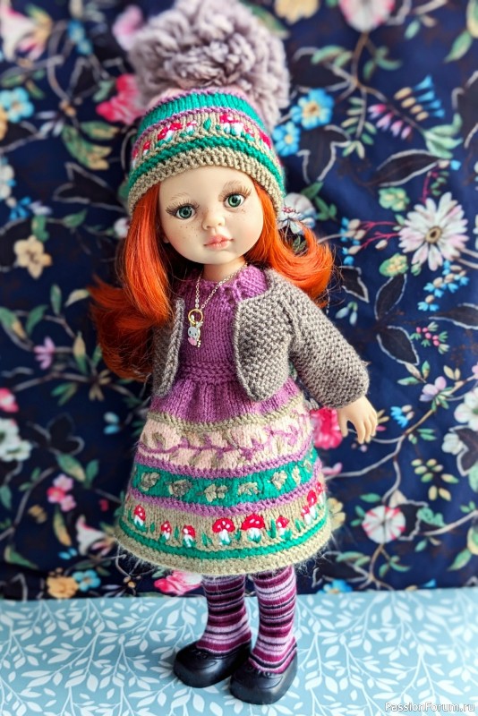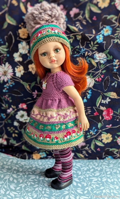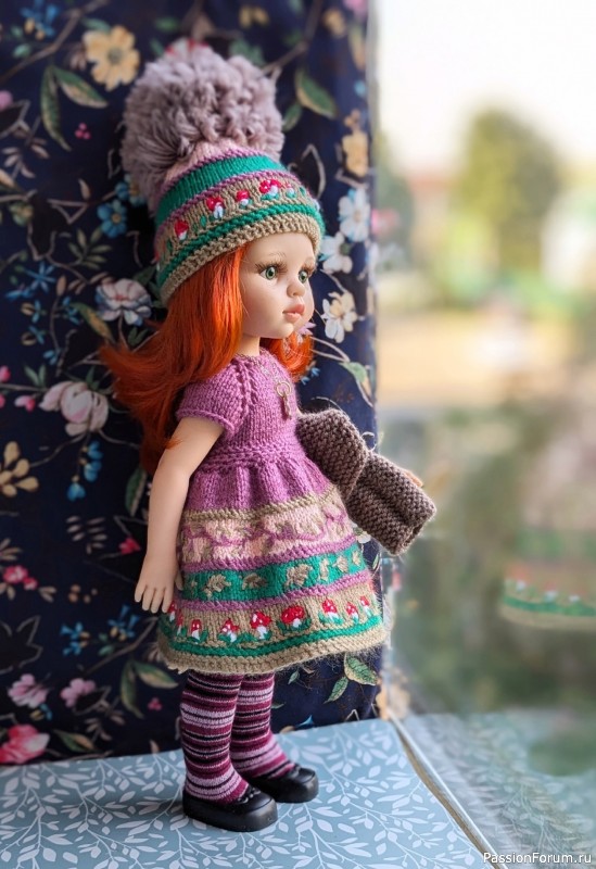 Ух какая прелестница! И грибочки, и цветочки у неё на платьице! Это вышивка или Вы вывязывали в эту красоту? Чулочки тоже сами вязали? Очень хорошо, прям очень...