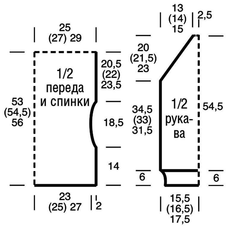 Через 34,5 см = 100 рядов (33 см = 96 рядов) 31,5 см = 92 ряда от начального ряда закрыть для регланного скоса с обеих сторон 1 x 1 п., затем в каждом 2-м ряду 28 (30) 32 x 1 п.
