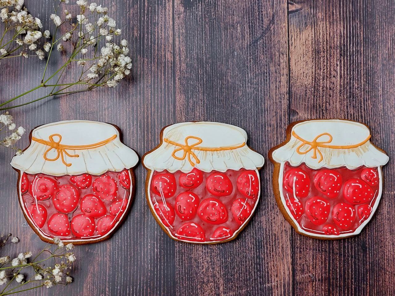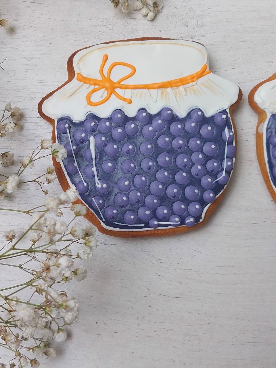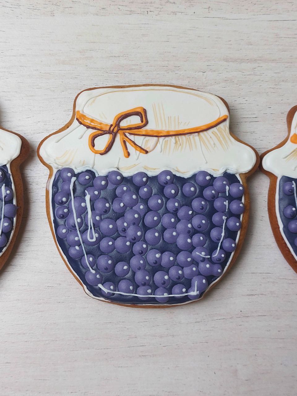 А баночки — пряники, это делала наборы пряников на заказ, очень меня увлекли эти баночки, с удовольствием росписывала, хоть и долго каждую ягодку глазурью рисовать. Есть вырубка у меня в виде баночки, так получилась эта серия.