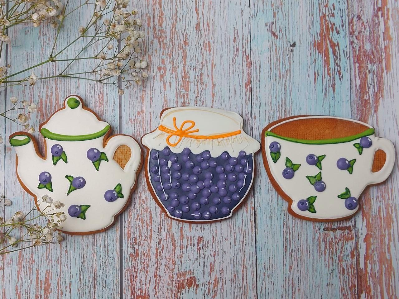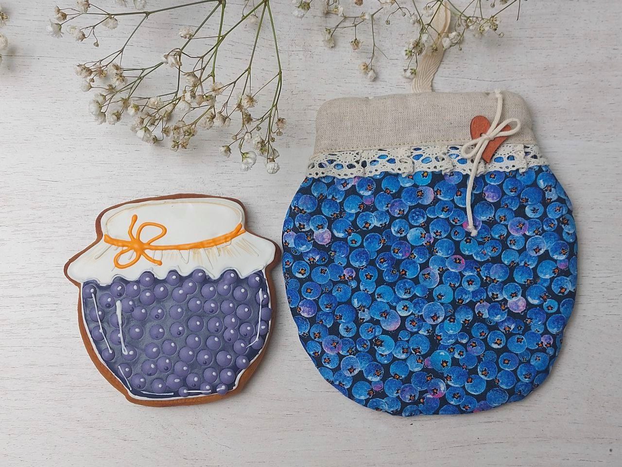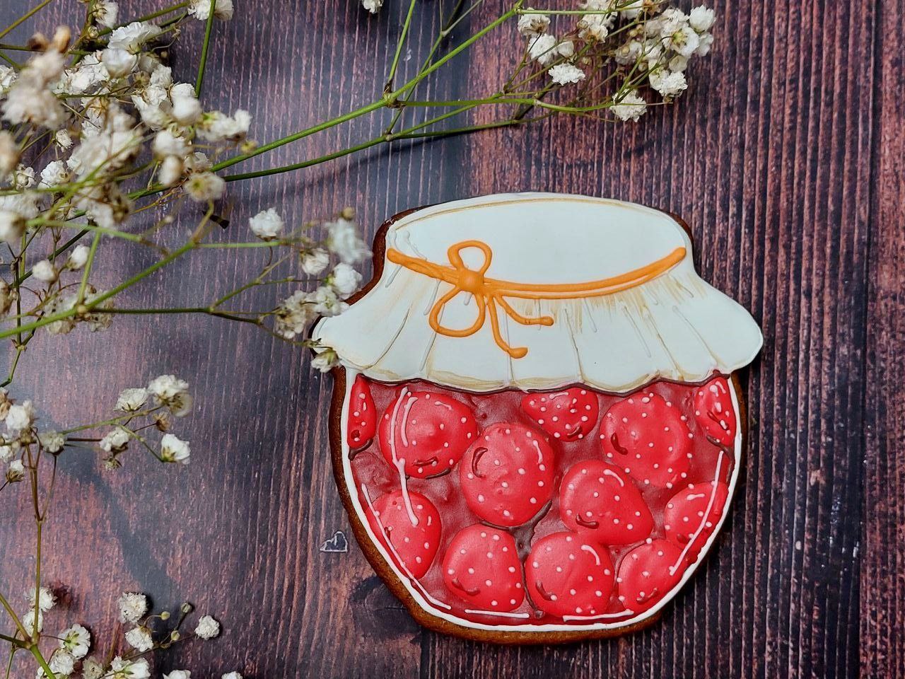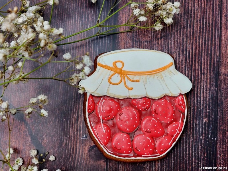 А баночки — пряники, это делала наборы пряников на заказ, очень меня увлекли эти баночки, с удовольствием росписывала, хоть и долго каждую ягодку глазурью рисовать. Есть вырубка у меня в виде баночки, так получилась эта серия.