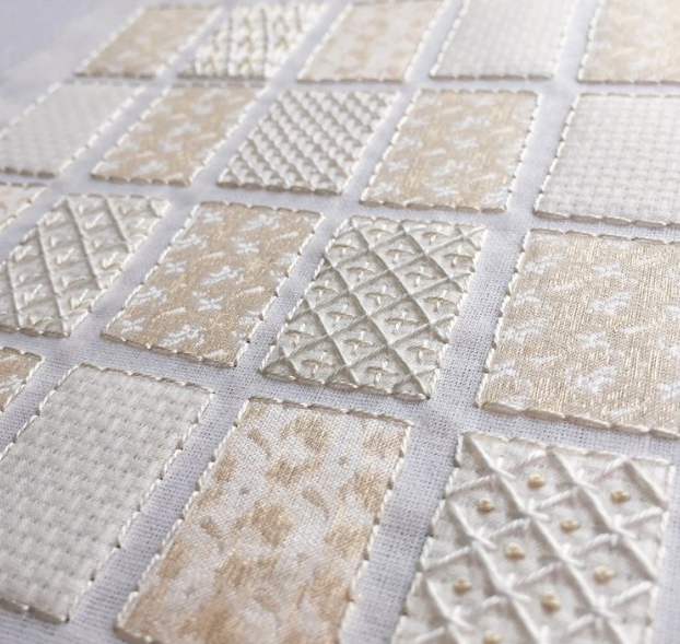 Всмотритесь ниже в эти заготовки: они состоят из фигур разных текстур, обшитых ручными стежками. Каждая фигура вырезана из разных тканей, и некоторые дополнительно вышиты простыми стежками. Смотрится очень фактурно и необычно.