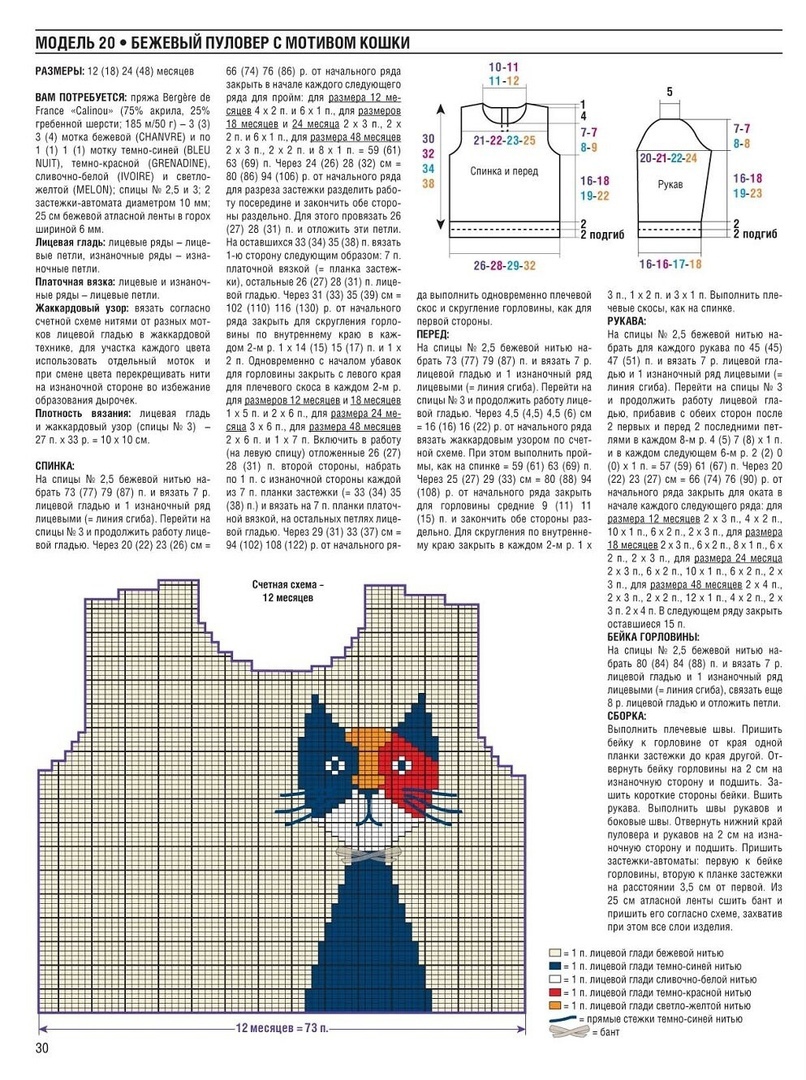 Детский бежевый пуловер с мотивом кошки и атласным бантом, вяжем спицами девочкам до 3 лет. Детское вязание спицами детям до 3 лет