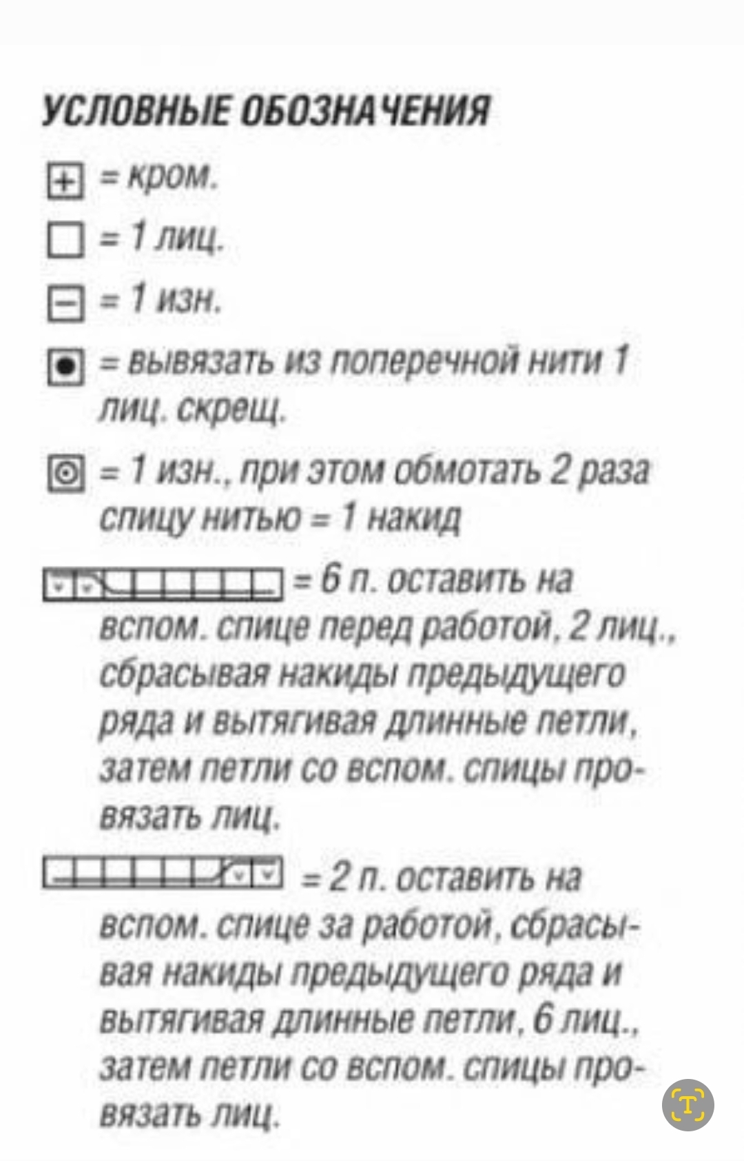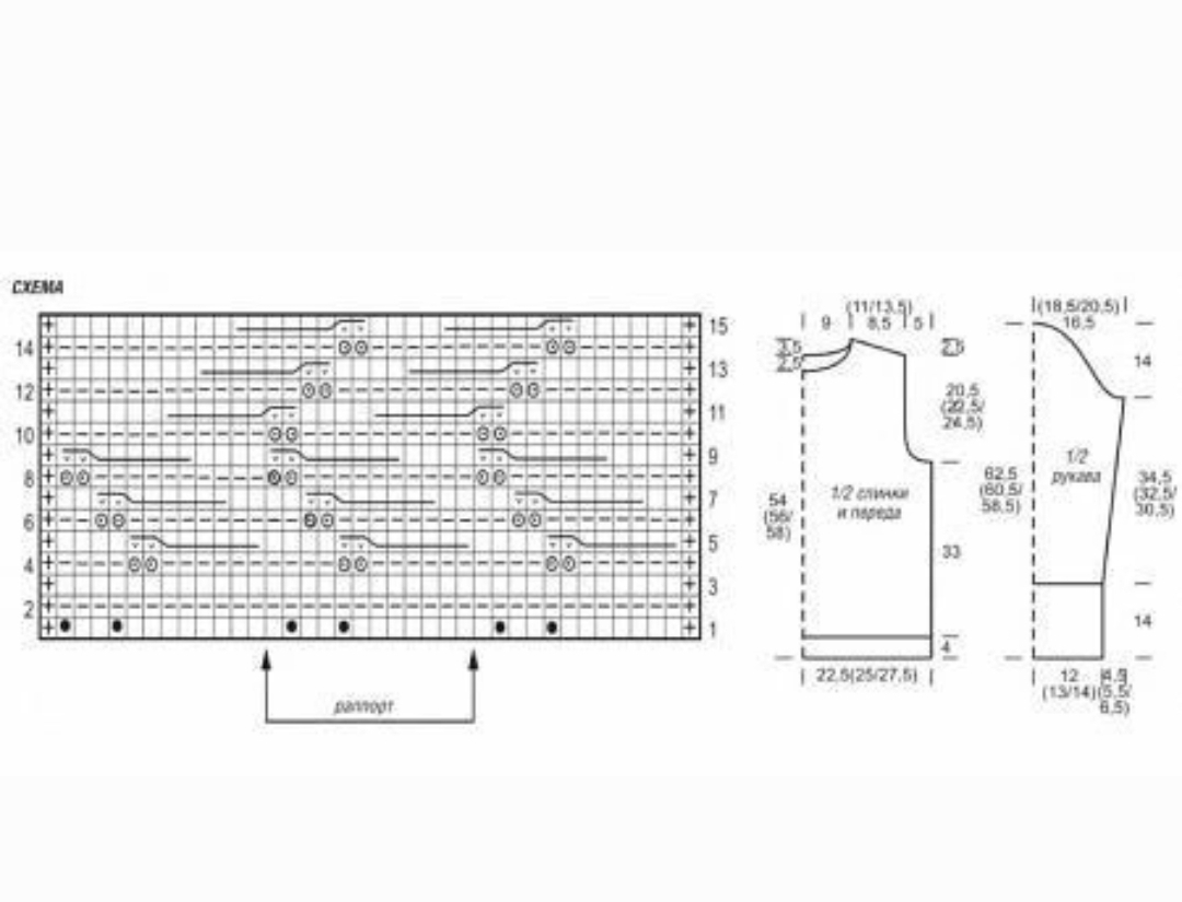 Узор с косами: число петель кратно 12 + 2 кром. Вязать по схеме, на которой приведены лиц. и изн. р. Начать с петель перед раппортом. 12 п раппорта между стрелками повторять, закончить петлями после раппорта. Выполнить 1-15-й р. 1 раз. затем 4-15-й р. повторять.