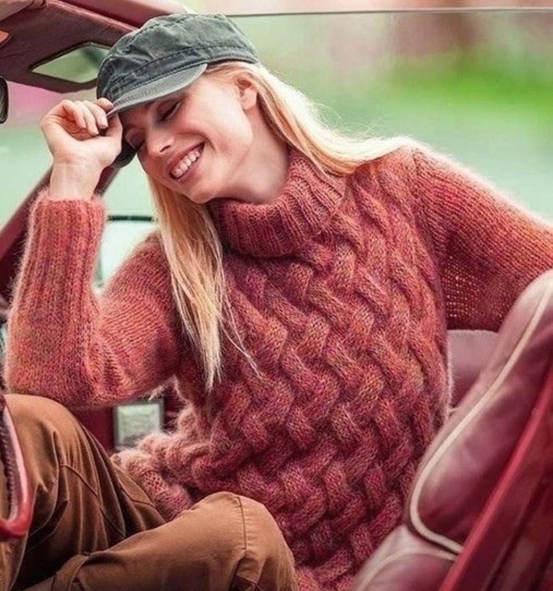 Сборка: выполнить плечевые швы. На круговые спицы № 6 набрать сложенной втрое нитью (= по 1 нити каждого вида пряжи) 84 п. и провязать 23 см узором для планок В. Петли закрыть. Втачать рукава. Выполнить швы рукавов и боковые швы.