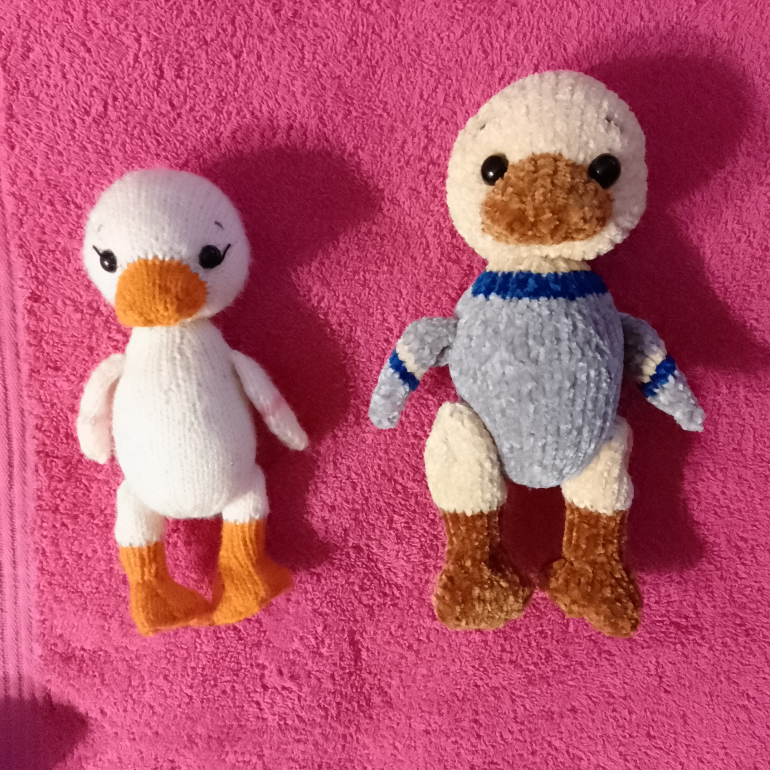 Утята, один плюшевый а второй, (белый) из акрила, размер игрушек 23 и 18 см, ножки т.е лапки крепятся на пуговичках так что их можно сажать.
