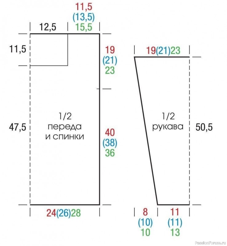 Вязать, как спинку, но с вырезом горловины. Для этого через 47,5 см = 69 рядов от начального ряда пропустить средние 58 п. и обе стороны закончить раздельно.