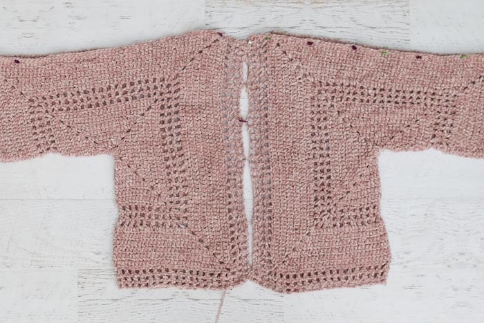 Надвязываем снизу на нужную длину. Обвязываем горловину, полочки и нижний край изделия 2 рядами столбиков без накида и 1 рядом «рачьего шага». При этом на полочках во 2-м ряду можно выполнить отверстия для пуговиц: для мальчиков - на левой стороне, для девочек на правой стороне. Ширину манжет тоже можете сделать на свое усмотрение: можно сократить, вяполняя обвязку через одну петлю или оставить широкой.