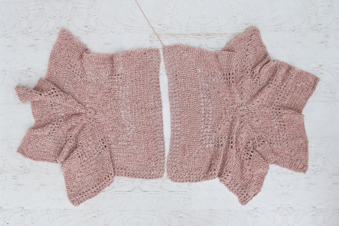 Раскладываем вязание симметрично. Надвязанными рядами друг к другу. Вторая надвязанная сторона внизу.