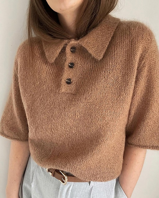 Футболка Maren вяжется сверху вниз, начиная с воротника. Для достижения идеальной посадки спинки и выреза горловины используются укороченные ряды. Перед и спинка вяжутся отдельно. Затем поднимаются петли по переднему краю и вяжутся двойной (полой) вязкой. Затем перед и спинка соединяются, и вязание продолжается по кругу. И наконец, поднимаются петли вокруг пройм, для вязания рукавов по кругу