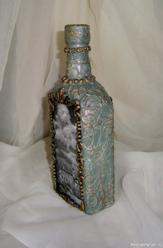 На обратной стороне бутылки рисунок через трафарет текстурной пастой, листики с ягодками из массы для лепки.