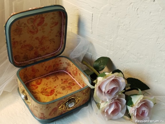 Заготовка, подрисовка, акриловая краска, акриловый лак, фрагментами розы и листики из холодного фарфора, лазерная распечатка, декупажная карта, битумная патина, тесьма, фурнитура.