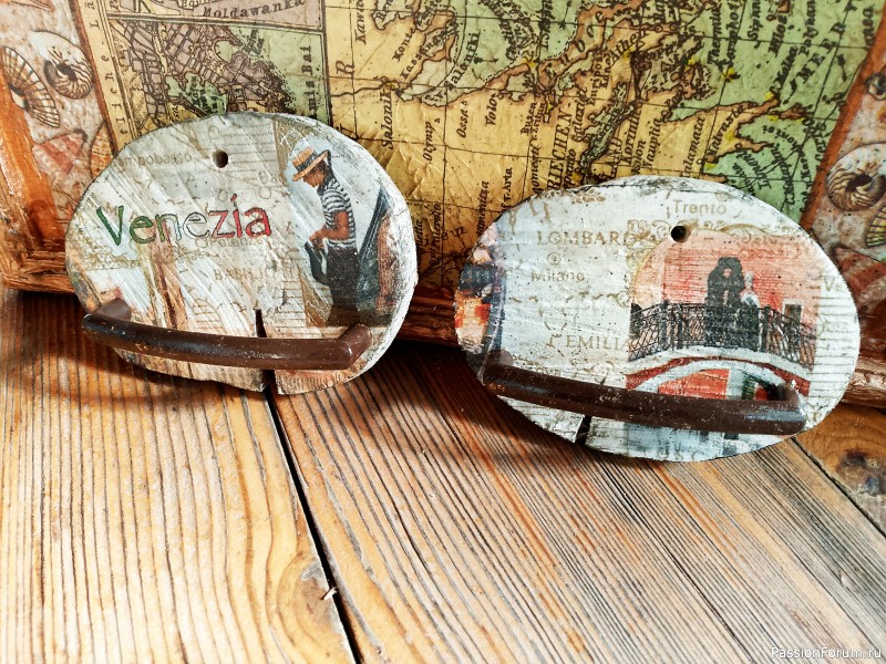 Спилы, салфетка, ручки со старой мебели окрашенные кракелюром и акрилом, матовый лак алкидный.