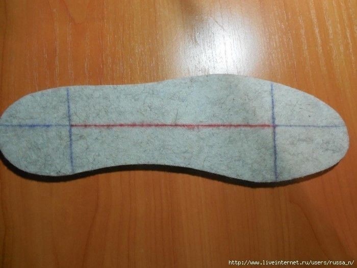 Делаем выкройку своей ступни ( на бумаге обводим ступню карандашом и по контуру вырезаем ). Проводим линии по самой широкой части пятки и мыска - на этой выкройке 2 вертикальные синие линии. Проводим линию от самой выступающей части мыска до самой выступающей точки пятки. Между 2 вертикальными линиями я выделила отрезок красным цветом - эту длину красного отрезка набираем первоначально. Не забывайте, что вязаное полотно растягивается.