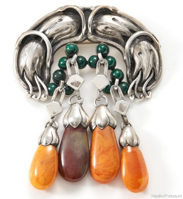 Брошь с янтарем и малахитом, Георг Йенсен, Дания.