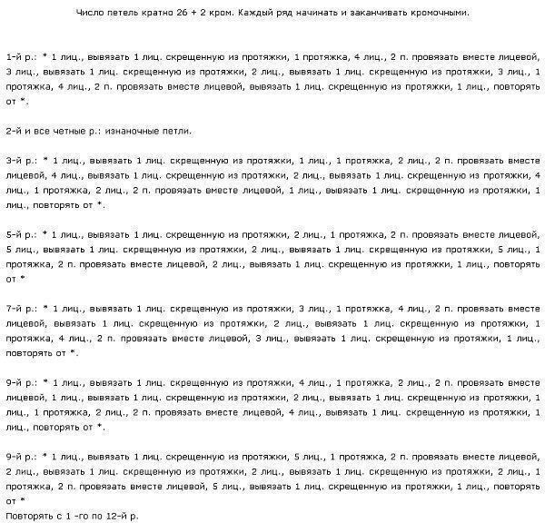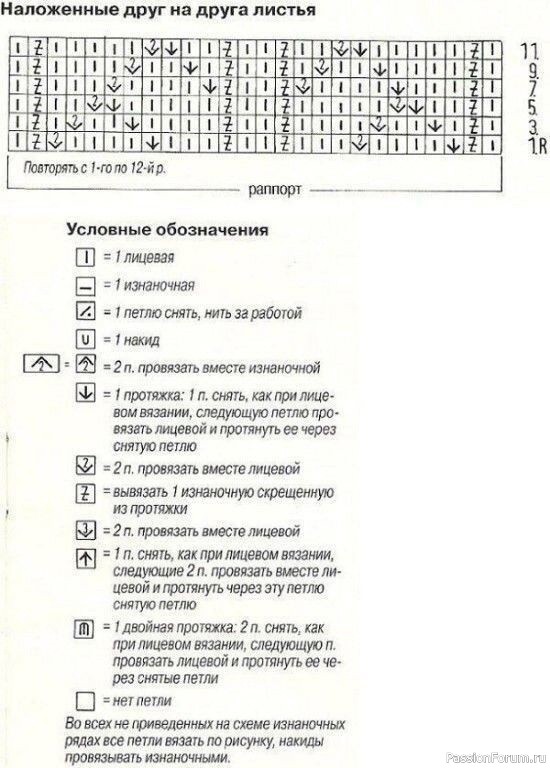 Оригинальный, не избитый и новый узор "Наложенные друг на друга листья", связанный спицами. Такой узор можно комбинировать друг с другом, как это показано на вязаном снуде, широкие листья, скомбинированы с узкими. Рапорт узора предполагает 12 рядов в высоту. Количество петель в узоре должно быть кратно 26, плюс обязательные две кромочные петли.