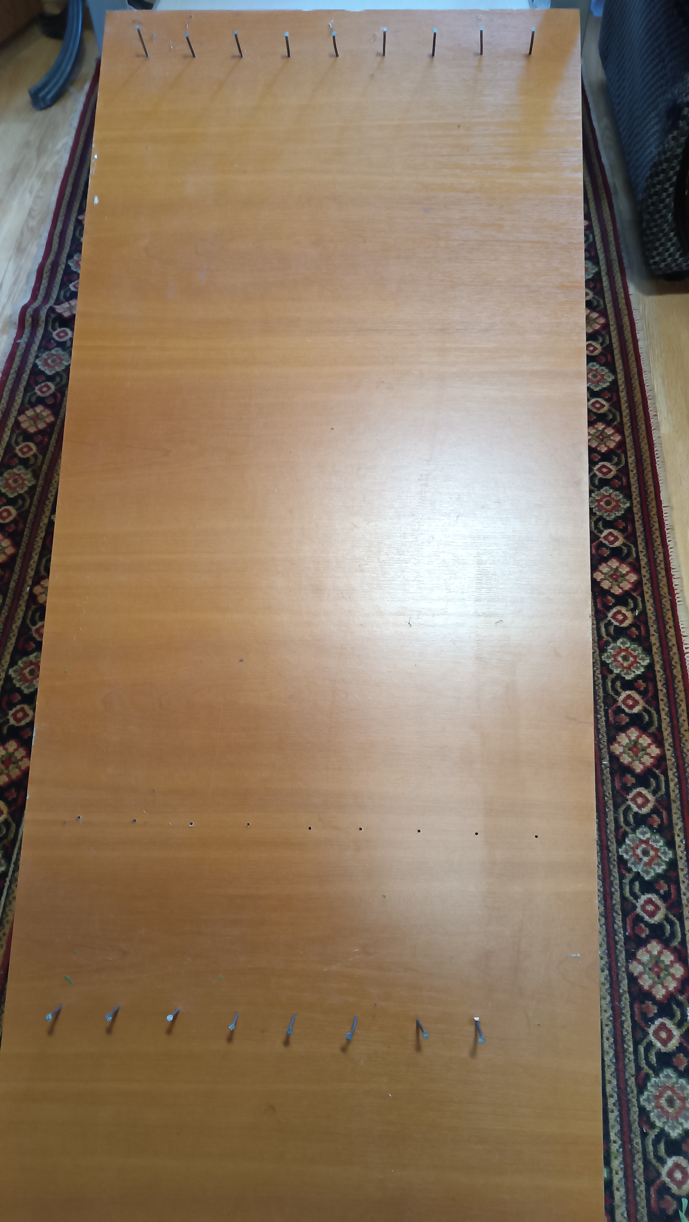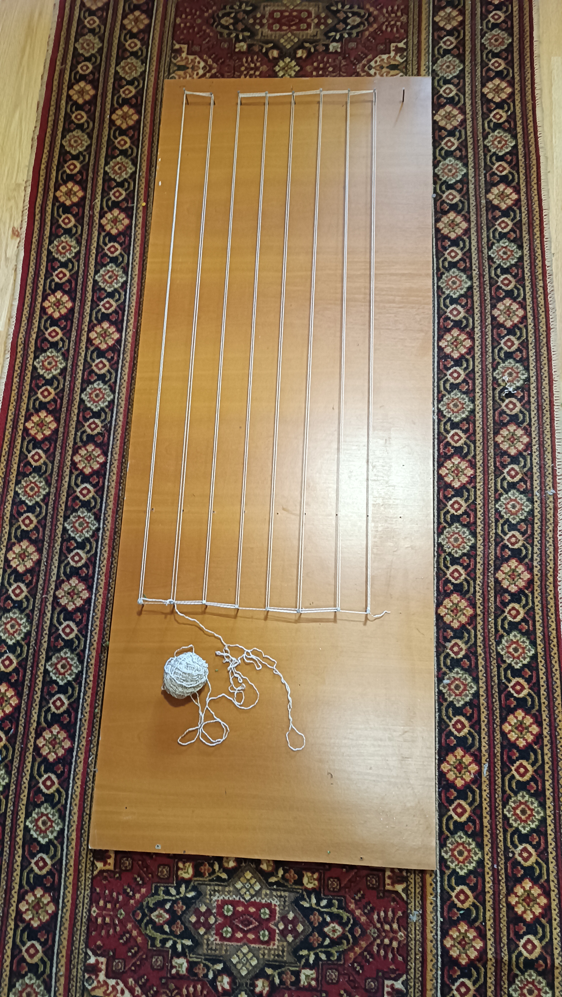 Всем добрый день. Сто лет я ничего не выкладывала,но на сайт захожу регулярно,все просматриваю. Этой осенью занялась новым видом рукоделия и конкурс ко времени пришелся. Это увидела в интернете,там много разных мастер классов. Но у меня получился свой. Это доступно абсолютно всем,причем все что для этого нужно точно есть на каждой даче и доступно каждому . Я люблю делать то,что может как-то в быту пригодиться. Делала для дачной жизни, но мой сын в квартире на кухне повесил,и очень удачно вписалось в интерьер. Итак начнем. В интернете для создания таких ковриков показывают специальные ткацкие станки. Я использовала то,что было под рукой.
