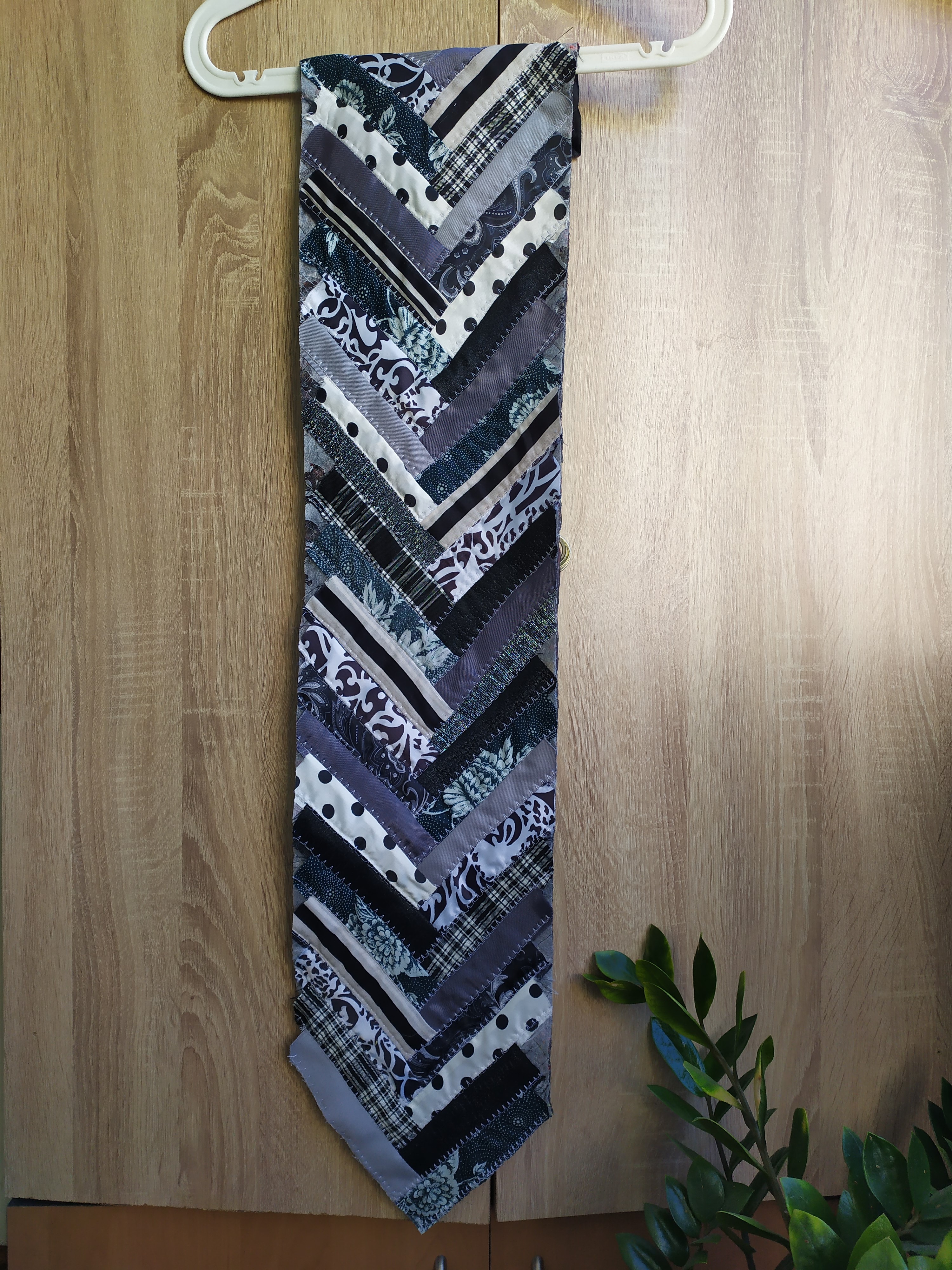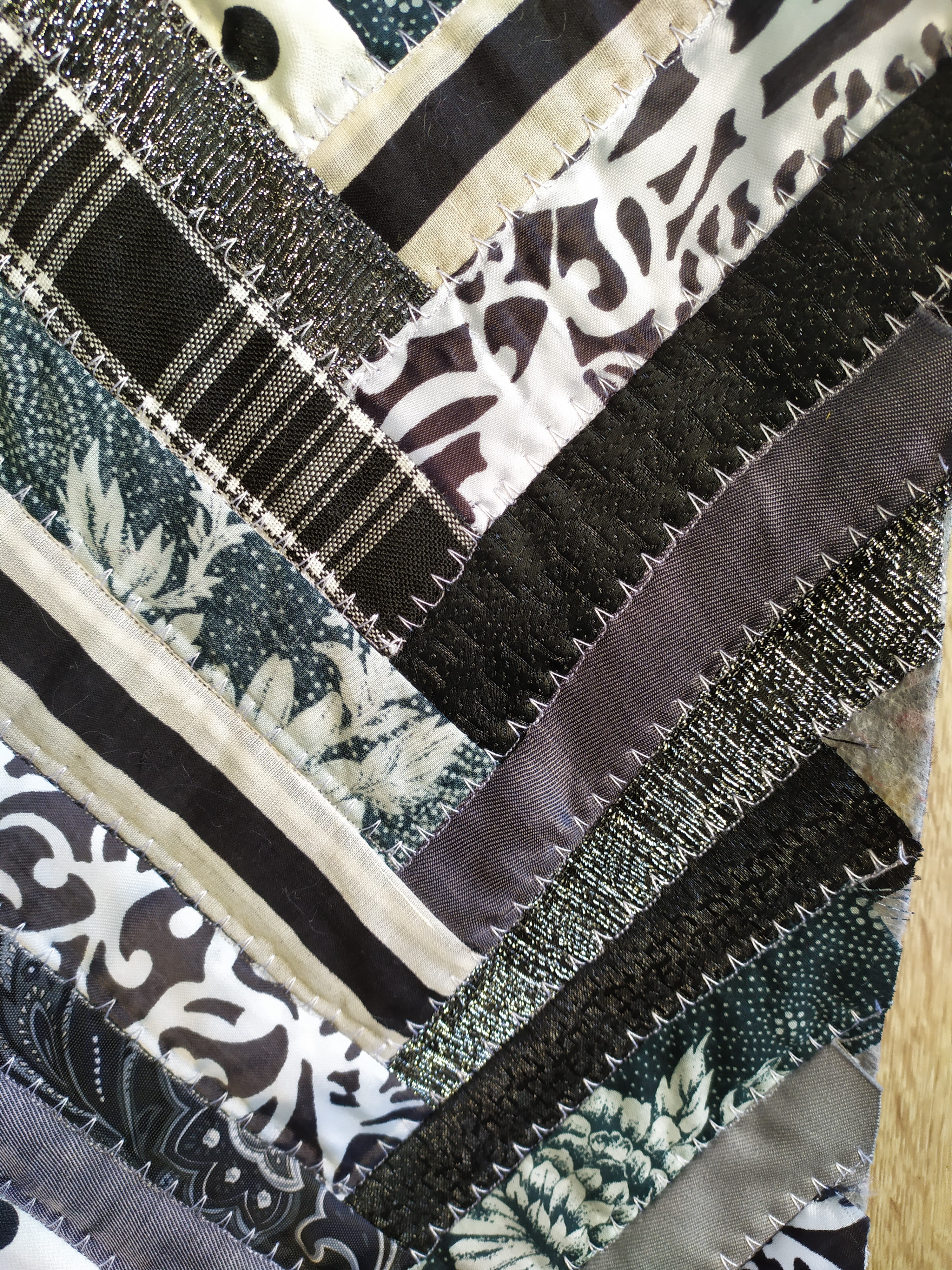 Сначала подбирала лоскутки. Это были ткани разнородного состава, толщины и происхождения. Что-то взято от старых изделий, что-то от лежащих с незапамятных времен новых тканей. Но критерий был дан — все они имели ахроматический окрас. Тканей однотонных нейтральных должно было быть побольше, чем принтованных.