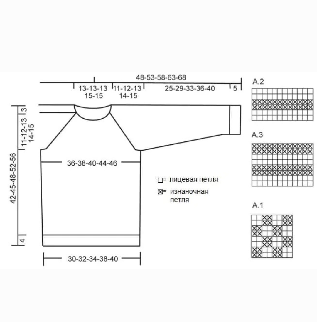 Потом перейдите к вязанию текстурным узором по схеме А1 и одновременно прибавьте по 1 петле с обеих сторон от каждого МК. Повторите прибавки в каждом р. еще 7/7/9/10/11 раз, затем в каждом 2-м р. еще 11/13/13/14/15 р. (=240/256/272/296/312 п.). На высоте 8/8/8/9/9 см от середины передней части свяжите 1 вертикальный раппорт по схеме А2, а затем еще 1 р. по схеме А1.