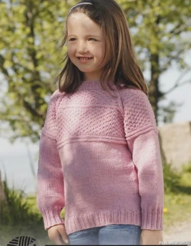 Такой пуловер можно рассматривать как базовую модель. Дизайн от студии Drops. Пуловер связан спицами регланом сверху на девочку от 3-х до 12-и лет