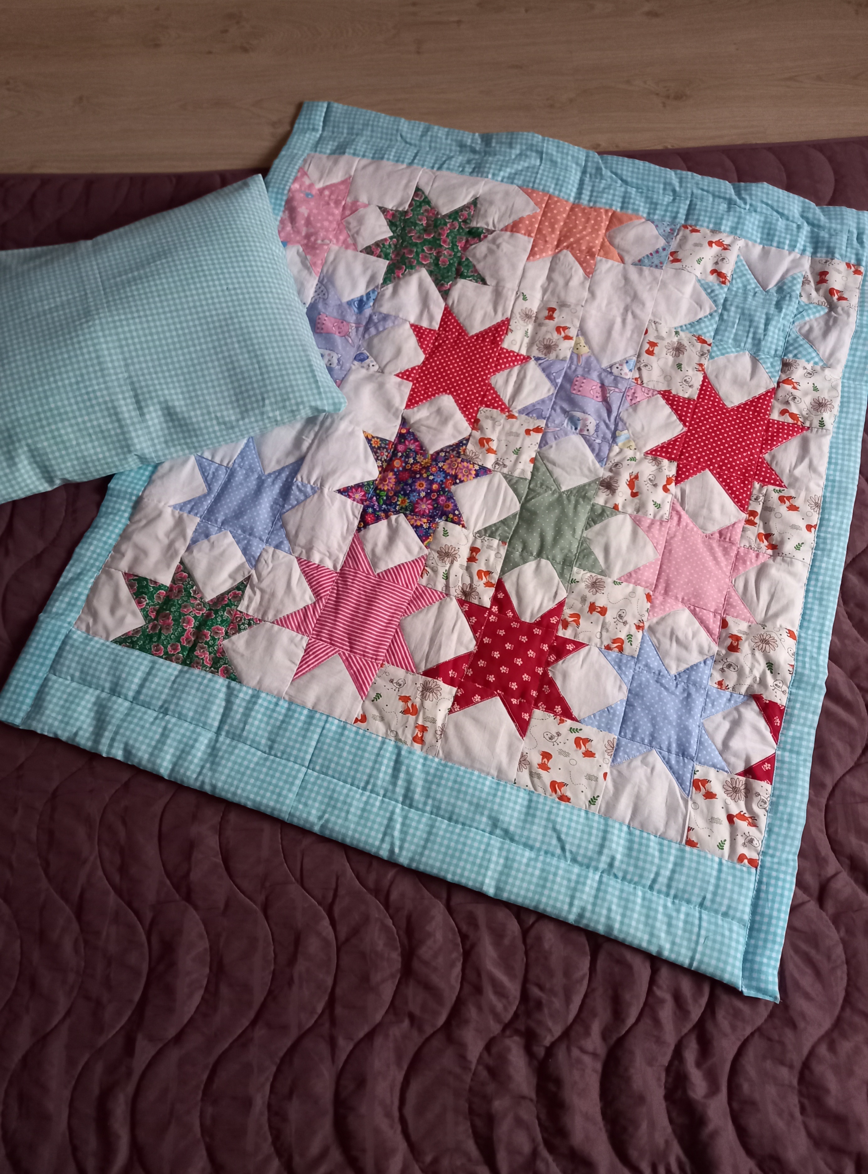Первое одеялко для новенького внучика, ему уже две недели. Размер 110× 120, к нему же из остатков ткани подушечку сшила.