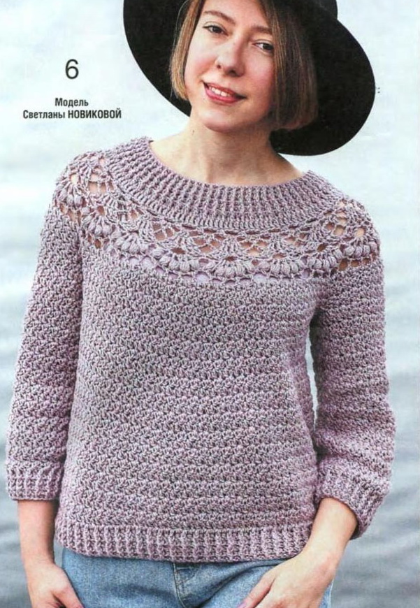 | Модель Светланы Новиковой Размер: S Вам потребуется: пряжа «Светлана» (50% шерсть, 50% акрил,250 м/100г) -350 г цвета пыльной розы, крючок № 3,5, маркеры. Рельефная резинка 1х1: вяжите попеременно 1 лиц. рельефный ст. с/н и 1 изн. рельефный ст. с\н. Пуловер вяжется сверху вниз вкруговую единым полотном. Наберите цепочку из возд. п. длиной, равной желаемой ширине горловины (количество петель должно быть кратно 8). Так как у данной модели широкий вырез горловины, прибавьте к обхвату головы ещё 10 см. Петли для начальной цепочки считайте по следующей формуле: ширину горловины разделите на количество см в образце и умножьте на 10(число столбиков в образце). Получившееся число подгоните под заданную кратность (8). Пример: свяжите образец из 10 ст. с/н. Высчитайте количество столбиков в 1 см. Получилось 1,8 ст. Измерьте обхват головы = 57 см + 10 см = 67 см. Умножьте на плотность вязания (67 х 1,8= 120 п.). Начальная цепочка состоит из 120 возд. п. Замкните цепочку в круг и вяжите первый ряд ст. с/н. Рукава: присоединить нить к середине подреза. В подрезе вязание выполняется между столбиками предыдущего ряда, а на петлях кокетки – в столбиках. В процессе вязания при необходимости выполняйте убавки вдоль петель подъема рукава, провязывая по 2 ст. с/н вместе. Таким образом убавки не будут видны. Низ рукавов оформите резинкой аналогично основной части пуловера. Присоедините нить к краю горловины и вяжите 1 ряд ст.с/н. Вяжите рельефную резинку поворотными рядами. Первые 2-3 ряда вяжите тем же крючком, затем возьмите крючок на 1 размер меньше и вяжите еще 2 ряда резинки. Таким образом горловина будет иметь более ровный край., Фото:vazhemkruchkom12019