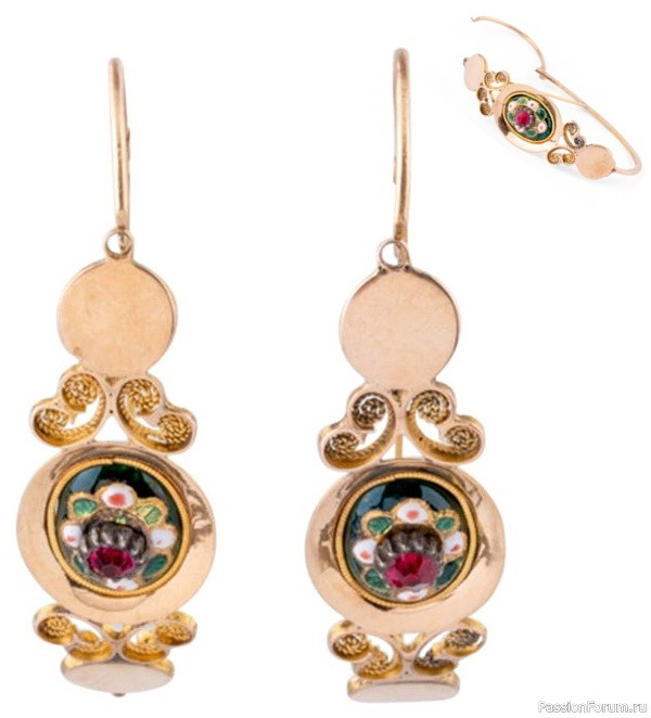 Серьги poissarde из золота с цветным стеклом, Франция, начало XIX века.