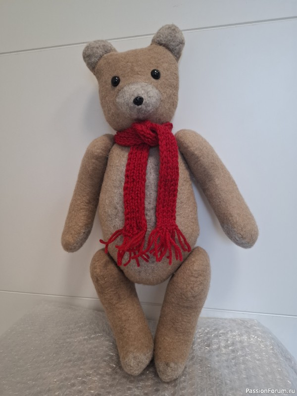 Я опять со своей детской темой. Дети - главный двигатель идей, ну а внуки - просто супер двигатель с акселератором :-). Очень захотелось сделать внуку нормальную игрушку, но только валяную, из натуральной неокрашенной шерсти. Если потянет в рот, то хоть краской не отравится :-) Ну и игрушку захотелось нормальную, а не гоблина, которые продаются в магазинах. В общем. замучила ностальгия по советским мягким игрушкам. Вот так родилась эта парочка. Важно сказать, что внучок, несмотря на совсем нежный возраст, очень позитивно на него отреагировал. Второй ушел другому малышу 3-х лет. Тоже ребенку мишка понравился. В общем, полевые испытания, я считаю, прошли вполне успешно. Руки-ноги у мишек подвижные. Пока не вижу раскручивания, сидят достаточно прочно. Крепеж рук и ног прилагаю.