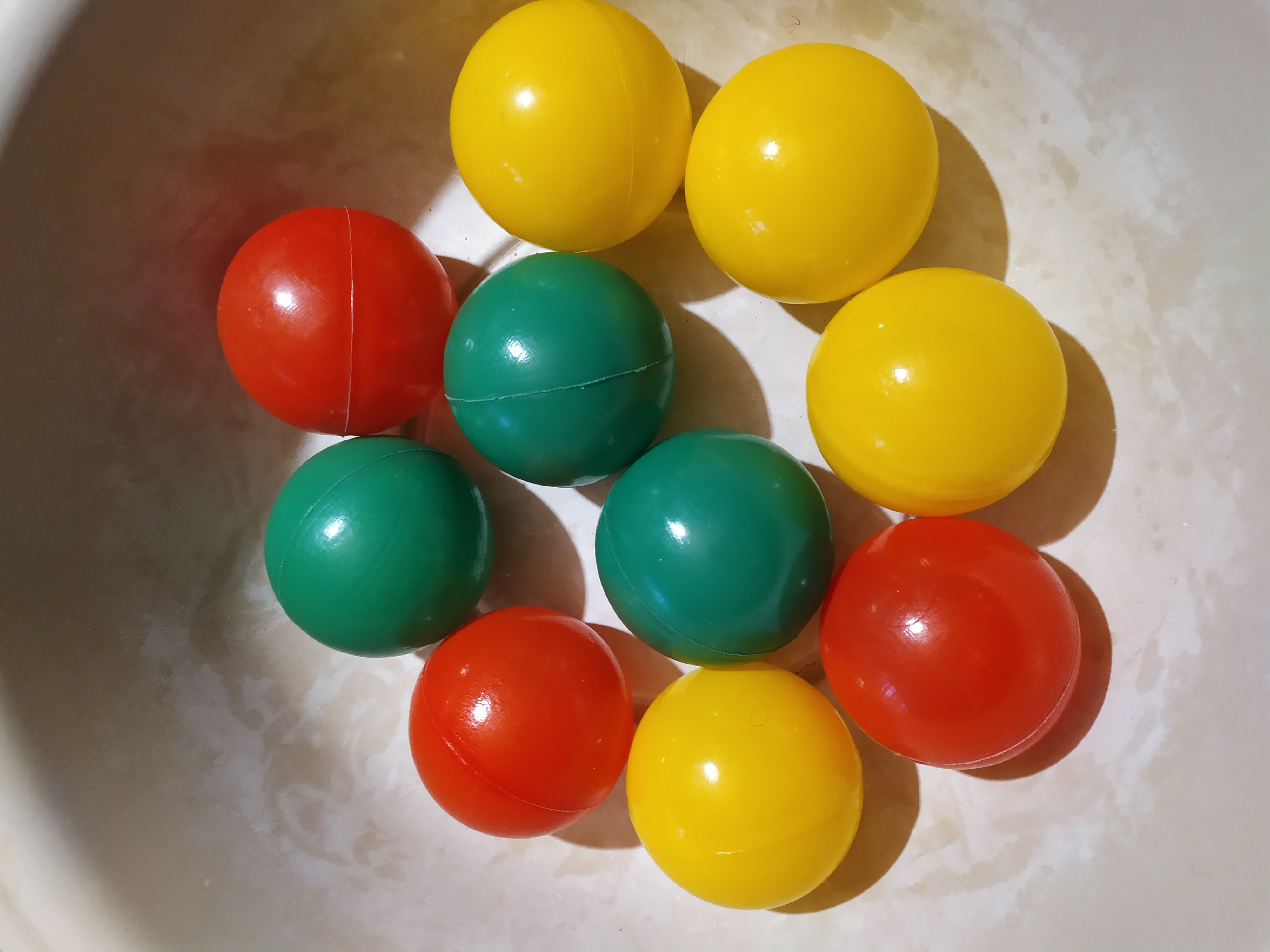На этот раз нашлась авоська с мячиками. Когда самый младший внук был младенчиком, в подарок ему были куплены эти мячики для игры на досуге, когда в гости его привозили. Учили с ним основные цвета: красный, желтый, зеленый. Мячиков ровно тридцать. Игры минут на десять хватало.