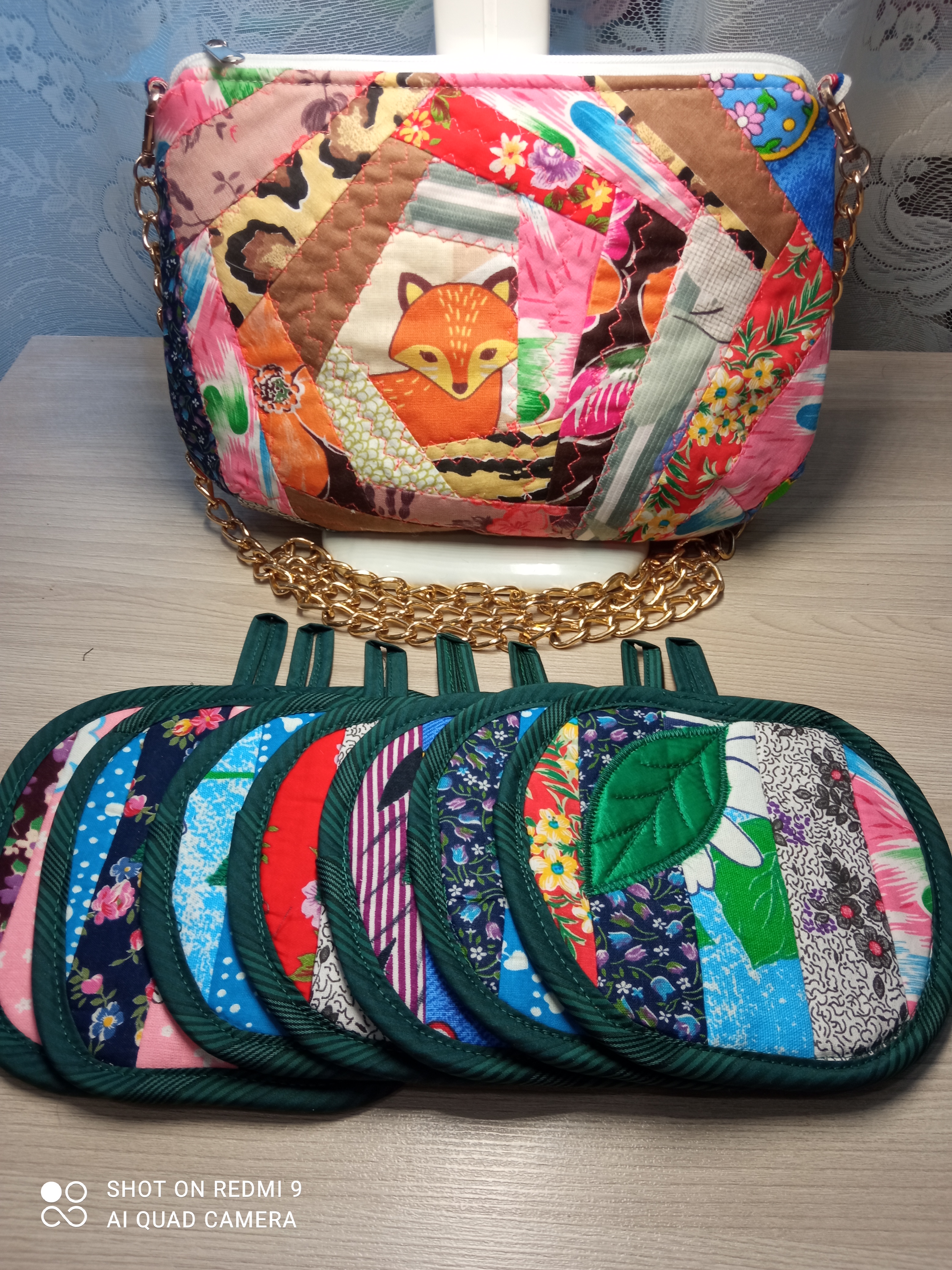 Марина, какое всё хорошенькое получилось! Лисичка красиво смотрится на сумочке, да и сама сумочка красивая, добротная, уютная. Интересные прихватки получились и листик освежает!