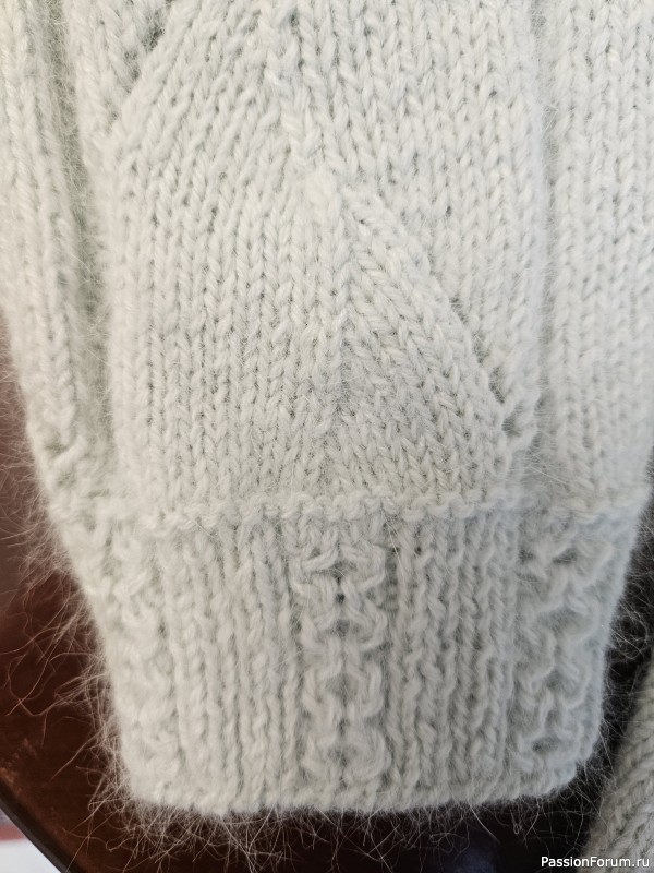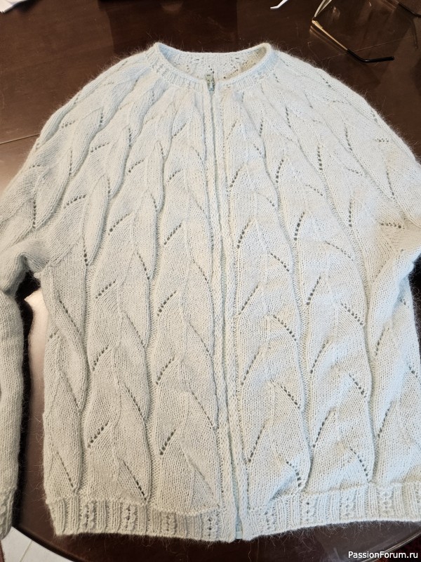 Здравствуйте. Связала новую кофту, ушло около 250 грамм пуха норки, спицы 3мм. Использовала японские схемы. Кофты на пуговицах не ношу, поэтому кофта на молнии. Вдоль молнии и воротника Ай корд. Низ кофты и рукавов сделан как фабричный край. Цвет - бледный аквамарин. Круглая кокетка, спущенная пройма, подрезы.