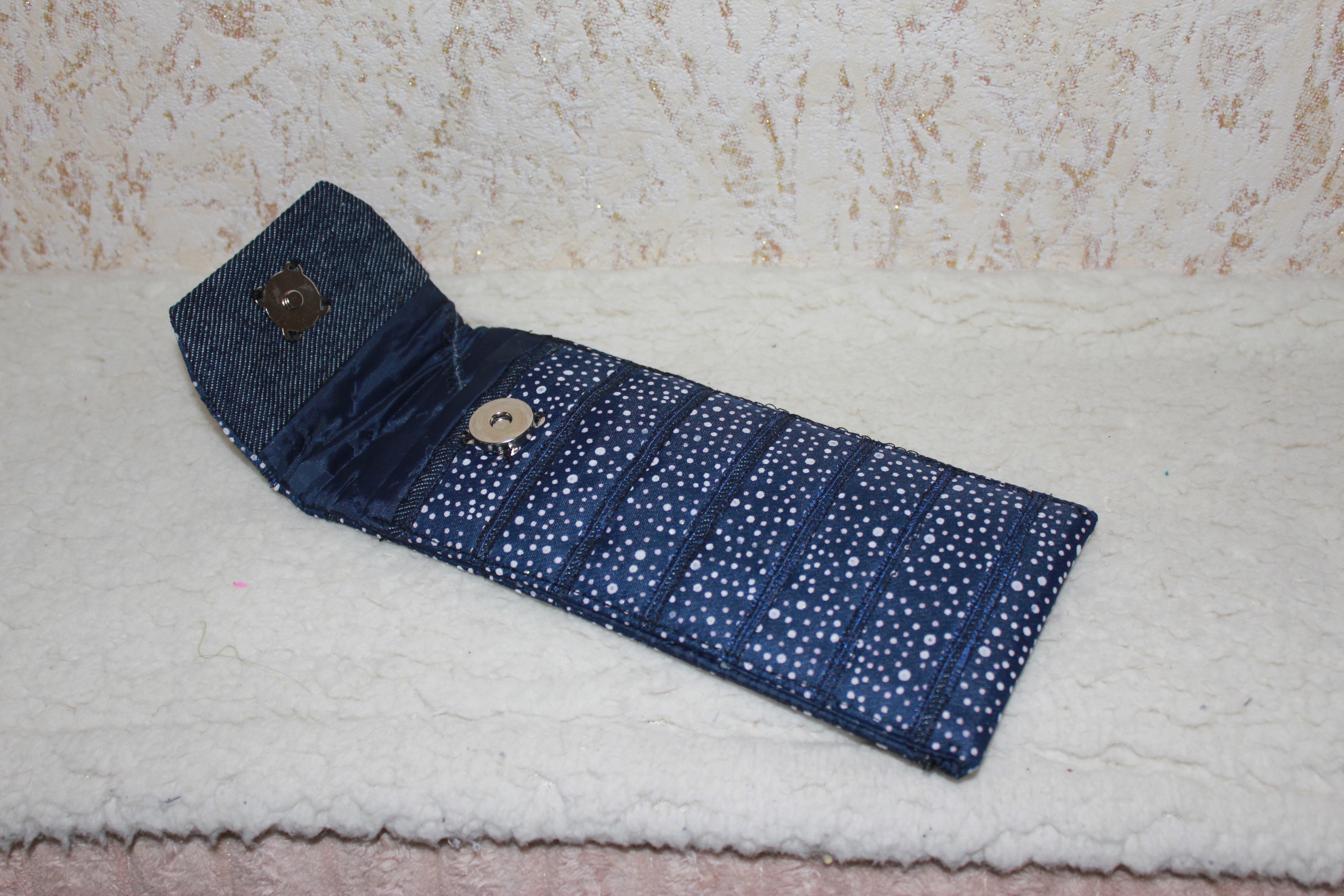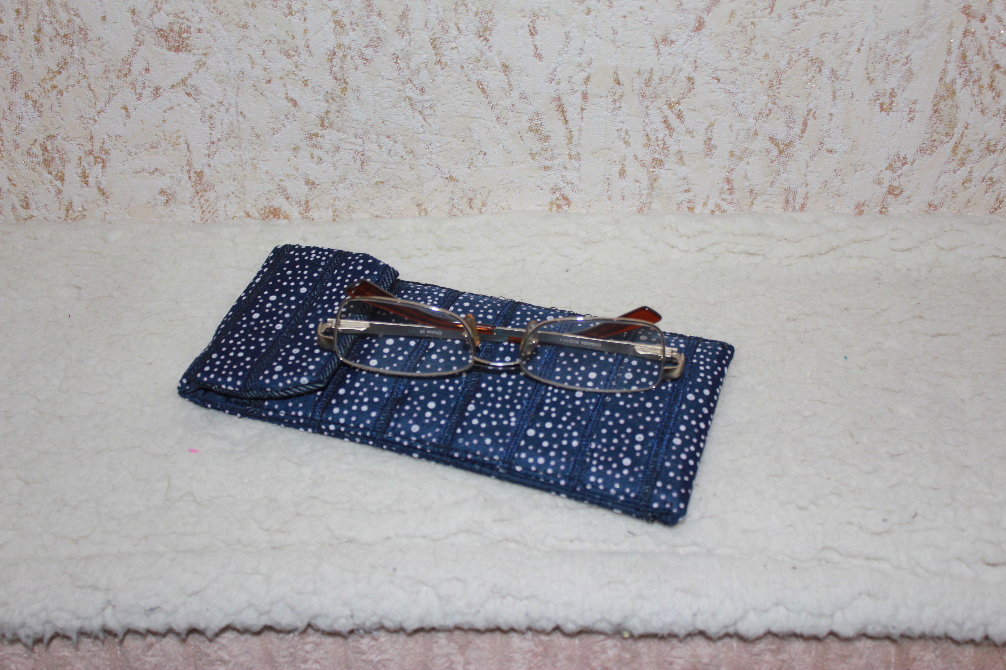 Мне срочно понадобились в подарок хорошему человеку два футляра для очков. В закромах имелись лоскуты разных тканей в большом количестве и отделочная тесьма. Первый футляр я решила сшить из остатков джинсовой ткани еще советских времен.