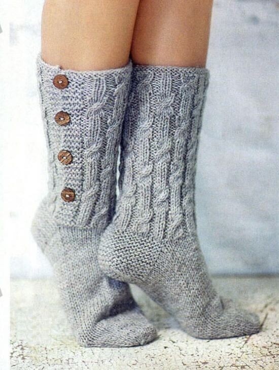 | Размеры: 30(38)42. Вам потребуются: Пряжа Novita 7 Veljesta (75% шерсть, 25% полиакрил, 100 м/50 г) -150(150)200 г светло-серого цвета 060. Прямые и носочные спицы №3,5. ~4,8 пуговиц. УЗОРЫ И ТЕХНИКИ ВЯЗАНИЯ Узор из кос: вязать по схеме. Повторять 1-16-й ряды. Платочная вязка: лиц. и изн. ряды — только лиц. петли. Лицевая гладь: при круговом вязании только лиц. петли. Плотность вязания: 21 п. лиц. глади = 10 см. ОПИСАНИЕ РАБОТЫ ЛЕВЫЙ НОСОК Наберите на прямые спицы 51(61)71 п., вяжите прямыми и обратными рядами 3 ряда платочной вязкой. Далее вяжите узором с косами следующим образом: провяжите первые 5 п. платочной вязкой, провяжите 1 п. перед раппортом, затем повторите 10 п. раппорта 4(5)6 раз, в конце провяжите еще 5 п. платочной вязкой. Продолжайте вязать петли узором из кос, провязывая крайние 5 п. с обеих сторон платочной вязкой для планок. Через 2 ряда вывяжите первую петлю для пуговицы по правому краю следующим образом: провяжите 1 лиц. п., 2 п. вместе лиц., выполните накид и далее вяжите петли по рисунку. Разделите оставшиеся петли на 4 спицы на крайние по 13(15)17 п на средние по 10(12)14 п. Спицу с отложенными 6 п. разместите под первой спицей и провяжите их в первом ряду вместе с петлями первой спицы = 40(48)56 п. Разделите на каждую спицу по 10(12)14 п. Смена ряда посередине задней части носка. Далее начинайте вывязывать пятку Для этого вяжите только петли 1-й и 4-й спиц = 20(24)28 п. Остальные петли отложите. Вяжите прямыми и обратными рядами платочной вязкой, пока всего не будет провязано 18(22)26 рядов. Далее выполняйте убавления пятки следующим образом: вяжите в лиц. ряду пока до конца ряда не останется 7(9)10 п., провяжите 2 п. вместе лиц. протяжкой (= снимите 1 п. не провязывая, провяжите 1 лиц. п. и протяните ее через снятую петлю) поверните работу. Снимите 1 п. как лиц. не провязывая, провяжите 6(6)8 лиц. п. и следующие 2 п. провяжите вместе изн., поверните работу. Снимите 1 п. как лиц. не провязывая, провяжите 6(6)8 лиц. п. и 2 п. вместе лиц. протяжкой, поверните работу. Продолжайте выполнять убавления таким образом, пока на спицах не останутся только средние 8(8)10 п. Разделите эти петли на 2 спицы по 4п.(по 4п.)по 5п. После этого по левому краю пятки на 1-ю спицу равномерно наберите 9(11)13 п. 1 п. между спицами, на эту же спицу снимите петли левой части пятки, далее вяжите петли 2-й и 3-й спиц по рисунку затем на 4-ю спицу наберите 1 п. между спицами и 9(11)13 п. по правому краю пятки + снимите петли правой части пятки. Продолжайте вязать вкруговую на всех петлях лиц. гладью. Одновременно с этим вывязывайте клин подъема стопы следующим образом: на первой спице вяжите последние 2 п. вместе лиц. и на четвертой спице первые 2 п. вместе лиц. протяжкой. Провяжите 2 ряда без убавлений. Затем выполните еще 1 ряд с убавлениями, 3 ряда без убавлений, 1 ряд с убавлениями, 3 ряда без убавлений, 1 ряд с убавлениями и так далее, пока на каждой спице не будет по 10(12)14 п. Далее вяжите без убавлений 15(20)25 см (или пока не закроется мизинец). После этого начинайте вывязывать мысок следующим образом: посередине и в конце каждой спицы провяжите по 2 п. вместе лиц. = 32(40)48 п Провяжите 3(4)5 рядов без убавлений. Повторите ряд с убавлениями = 24(32)40 п., провяжите 2(3)4 ряда без убавлений. Далее выполняйте убавления в каждом 2-м ряду пока всего не останется 8 п. Обрежьте нить, стяните концом нити оставшиеся петли и закрепите. СБОРКА Слегка отпарьте носок. Пришейте пуговицы. ПРАВЫЙ НОСОК Вяжите симметрично ле