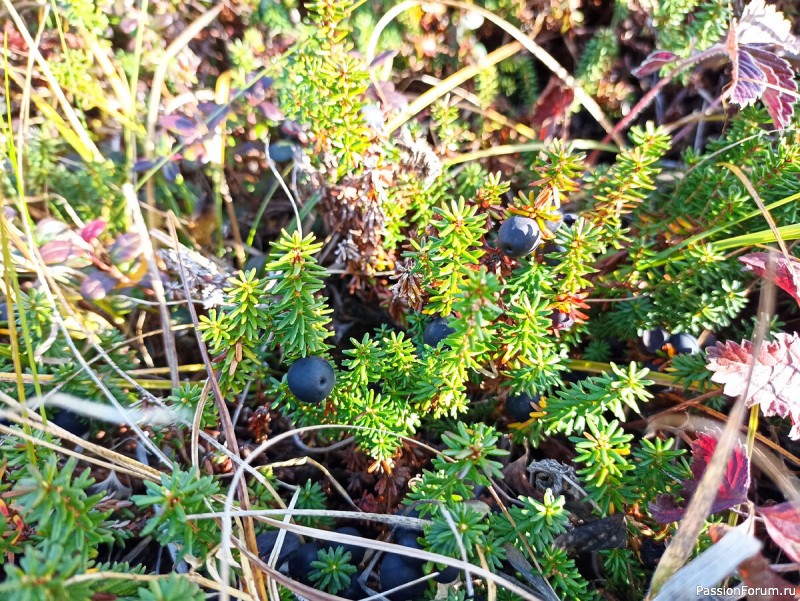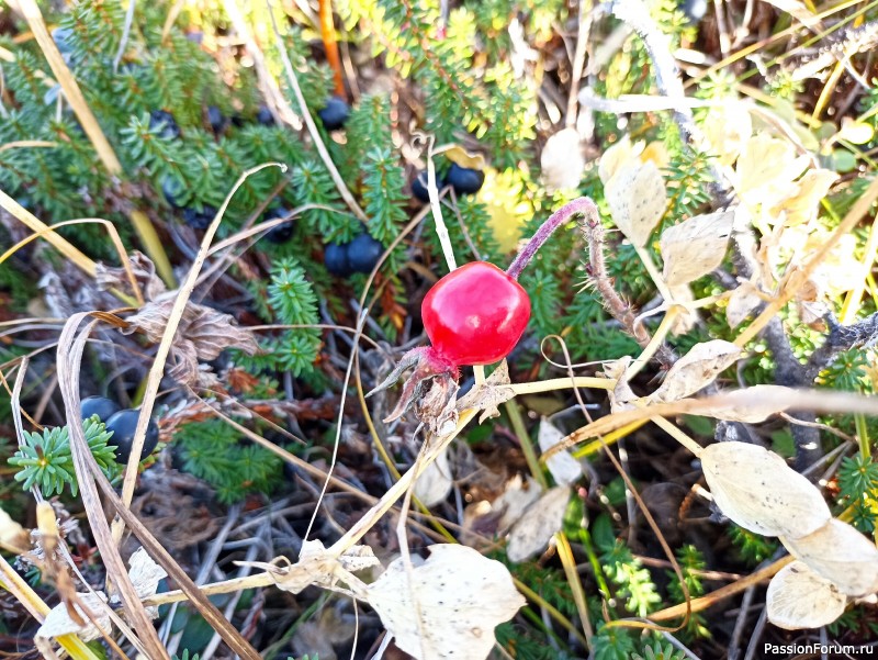 За пляжем начинается камчатская тундра, где растёт шикша, брусника, шиповник. Приехали сюда 6 октября, ягода была спелая, сочная - самое время для сбора. Красота и лепота! Наелись ягоды, собрали в пакетик немного, чтобы вечером дома полакомиться. Мужчина добавил к нашей добыче сорванные тут же гроздья рябины и маленькие шишки.
