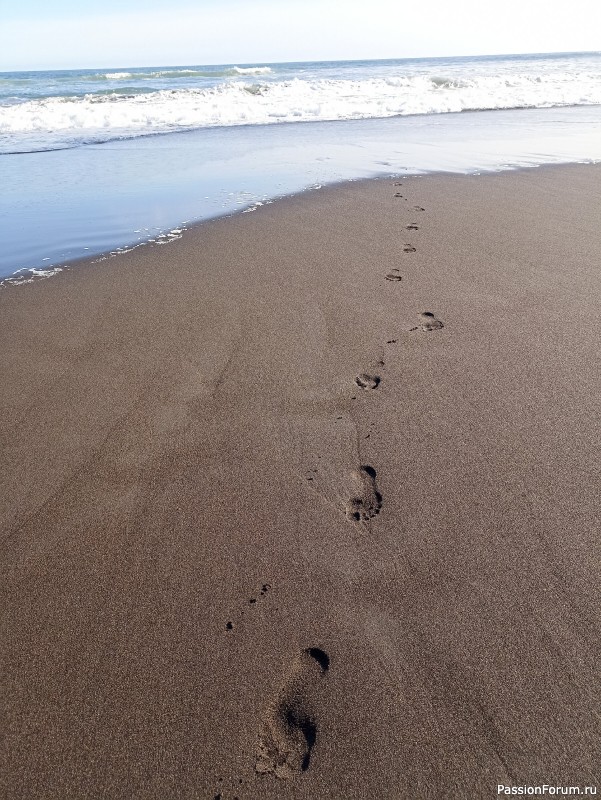Повезло с погодой: не было холодно, не было дождя и ветра, небо было чистое, море было синее. Очень красиво! Я разулась и пошла ходить по морской воде Тихого океана, по вулканическому чёрному песку. Я не фотогеничная дама, но на память хочется иметь фотографии, поэтому фотографируемся такими, какие есть. Я привыкла к холодному Охотскому морю, в тёплом Чёрном море купалась только в детстве. Поэтому для меня водичка Тихого океана привычна и приятна. Ноги воду терпят, я бы могла и окунуться, но ни купальника, ни времени не было. А теперь несколько фотографий со мной в кадре на берегу Тихого океана: