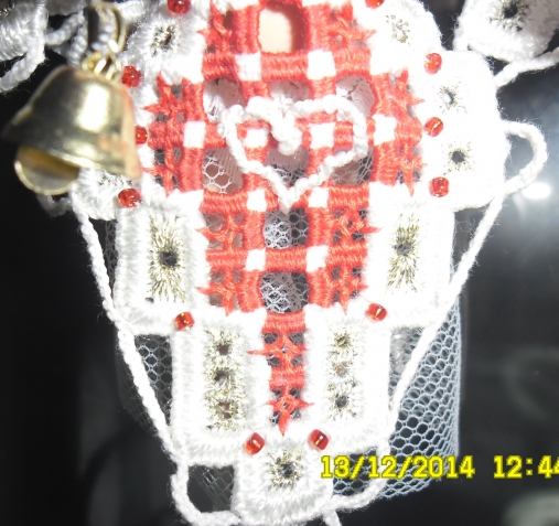 Выдернули ниточки и вышиваем голубиные глазки по схеме и перевитые бриды на четырёх нитках. Голубиные глазки и бриды вышиты у меня красными нитками Мулине. Далее вышиваем сердечко по центру передней части платьица по схеме. Прокладываем ниточки, закрепляя их за бриды и создавая форму сердечка, без натяга, свободно. Я обвивала их одиночной бридой белой толстой блестящей ниточкой tulip. Можно и обметать петельным швом. А можно, как это делала Валентина (Danika), нанизать на ниточки, обозначающие контур сердечка, мелкие-мелкие бисеренки. Так очень красиво получается! Далее украсила платьице красным бисером по контуру, а вокруг горловины по краю фигурного петельного шва пришила чередующиеся красные и золотистые (под цвет алжирских глазков) бисеренки. Получились бусики красивые, сама не ожидала!