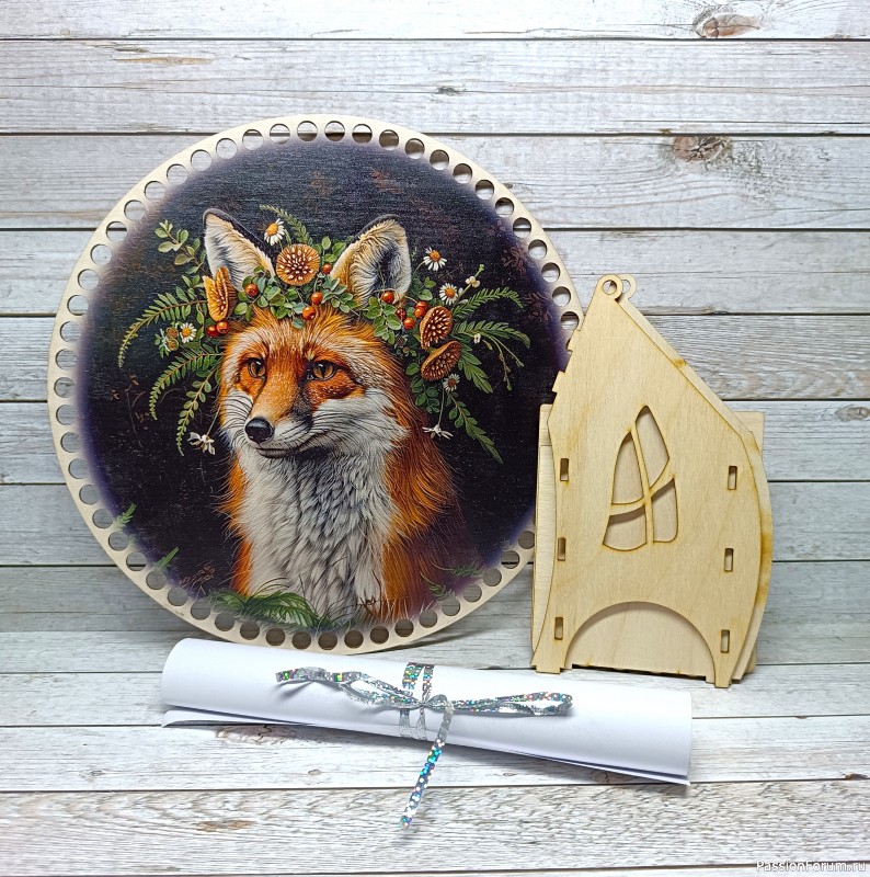 Я прямо влюбилась в лису, ну что за красотка! Это донышко для корзины, но она мне так понравилась, что я бы использовала заготовку как самостоятельную картину! Подумаю еще))). И заготовка чайного домика - вот такой наклоненный, с характером, сразу появляются мысли, как его задекорировать в сказочно-лесном образе! К подарочкам прилагается душевно письмо с поздравлениями в виде свитка.