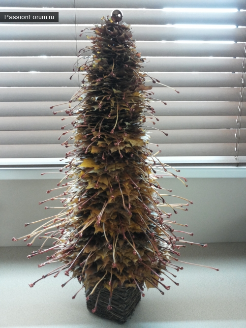 Листьев на елочку (50см) уходит много. Когда изделие готово, опрыскиваю лаком для свежих листьев, если нет, можно обычным лаком для волос. Сейчас кончики (по прошествии 3х дней) подсыхают, но все-равно смотрится хорошо. Мне сказали, что и венок и елочка 2-3 года точно простоят.