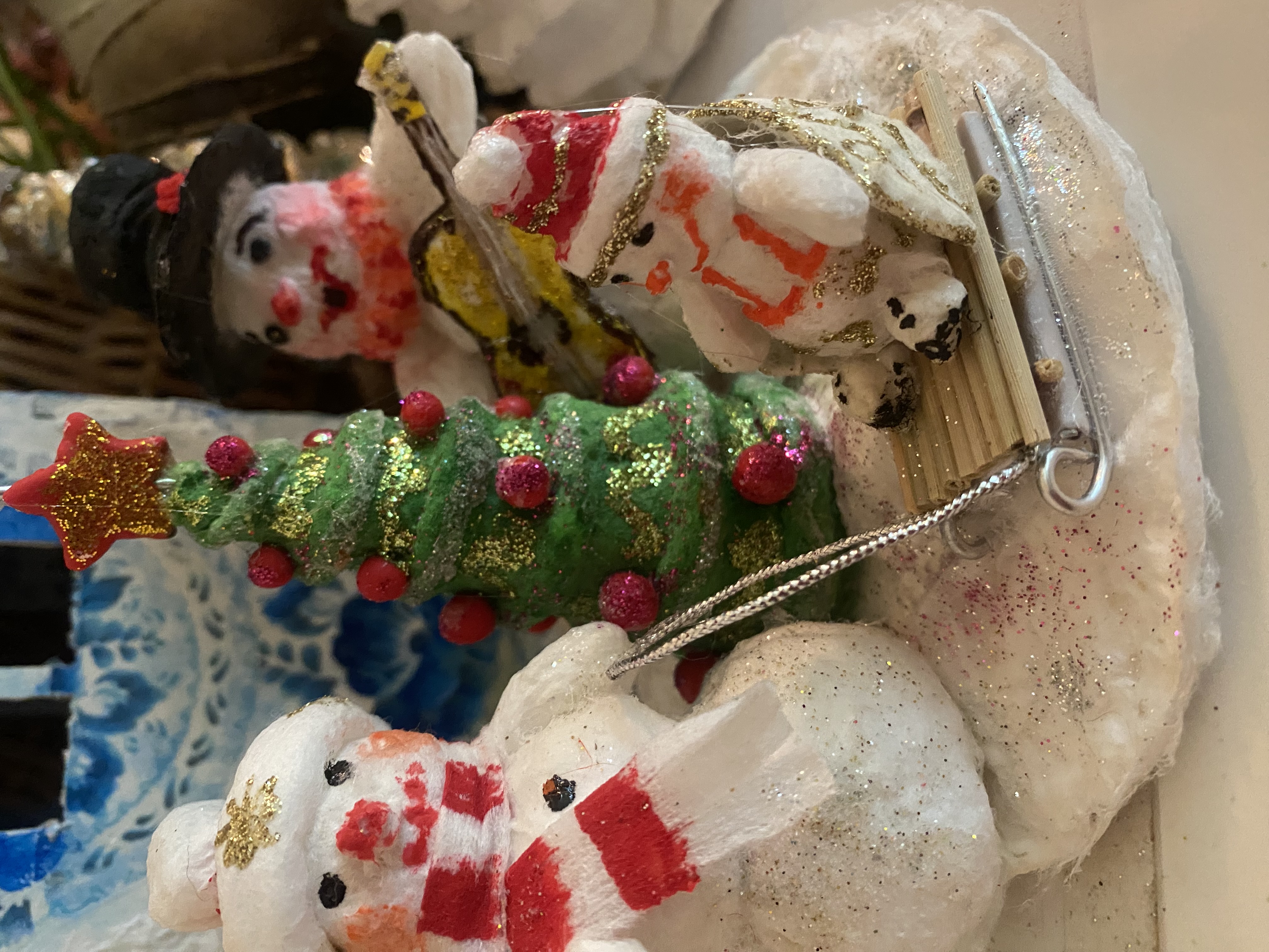 да, санки тоже мое творение. Из проволоки и стеблей сухих злаков, нут с добавлением ваты. Спинка у санок расписная. Подсела я на снеговичков