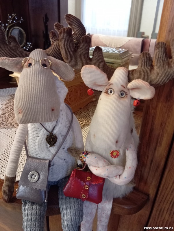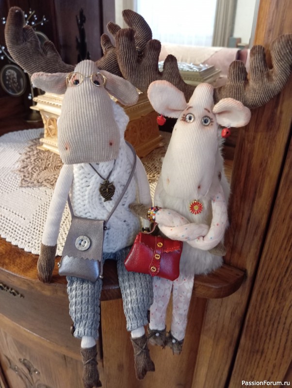 Очаровательные Лоси в красивой одежде, а Лосиха еще и модница( глазки подкрашивает, сумочку красивую прикупила, серьги такого же цвета как сумочка в ушки вдела...