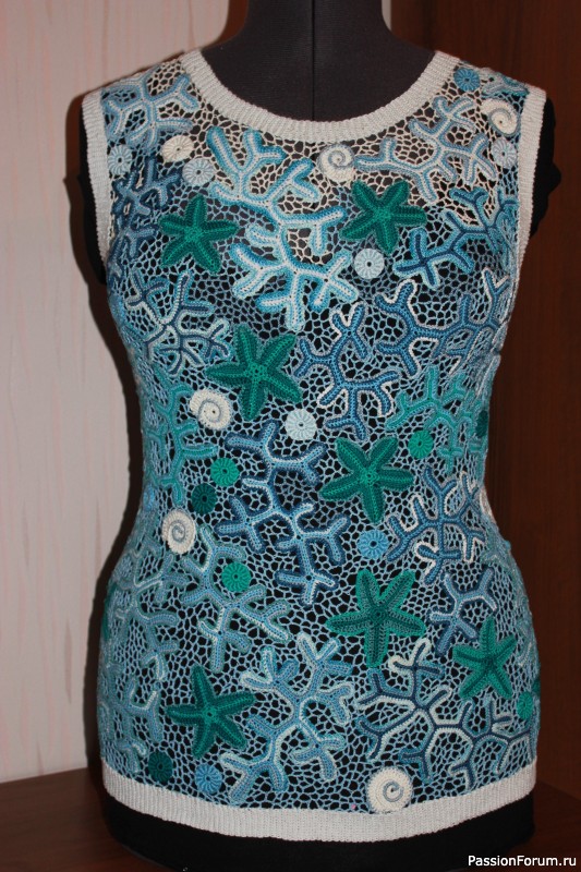 Я долго возилась с этим топом, мотивы мелкие,сеточка тонкая, каждый коралл связан из трех видов пряжи. Много узелков, каждый нужно тщательно и аккуратно закрепить, чтобы нитки не торчали. Наконец-то закончила. Сняла с манекена, вывернула налицо и - любимый момент! - примерила! Мне нравится! Море, море, мир бездонный!
