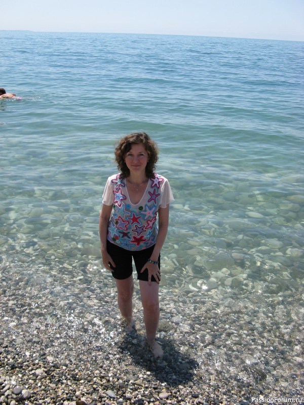 Морские звезды родом из 2008 года. Тогда я только училась вязать крючком. Первая моя майка в морском стиле была сшита из сетки, и на нее я нашила вручную множество разноцветных морских звезд. Прекрасное было время, мирное и безмятежное. И море тогда было чистое, без мазута.