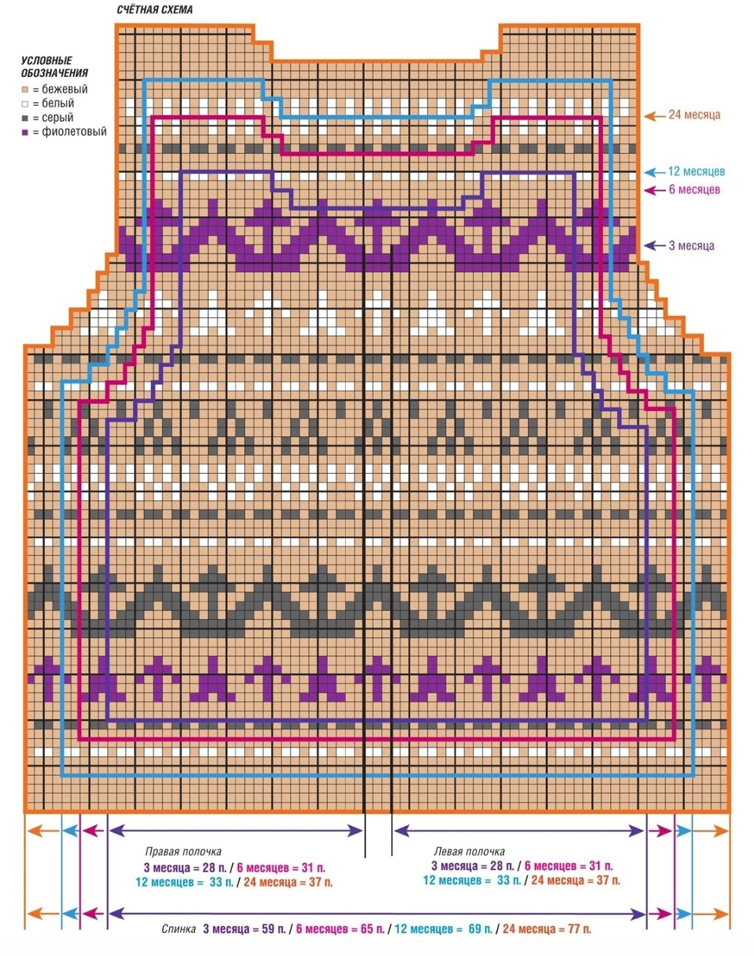 Спинка: на спицы № 3 набрать 59/65/69/77 п. бежевой нитью и связать 2 см = 8 р. резинкой 1/1. Перейти на спицы № 3,5 и вязать жаккардовым узором. Выполнить проймы и вырез горловины по счётной схеме.