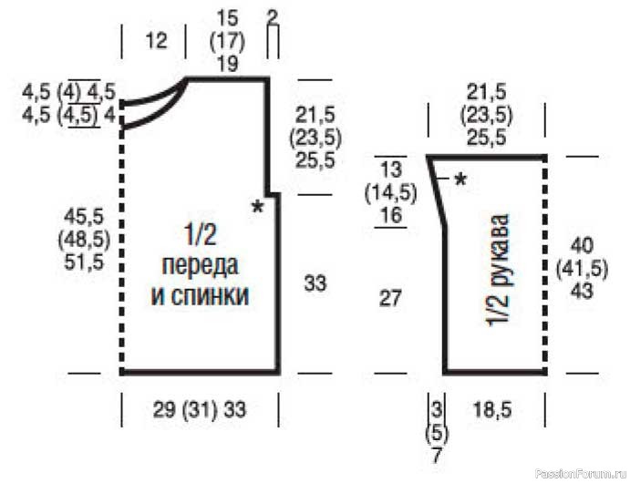 Через 27 см = 38 р. от начального ряда прибавить с обеих сторон для скосов 1 х 1 п., затем в каждом 6-м р. 2×1 п. (в каждом 4-м р. 4×1 п.) в каждом 4-м р. 3 х 1 п. и в каждом 2-м р. 3×1 п. = 45 (49) 53 п. На прибавленных петлях вязать узором 3.
